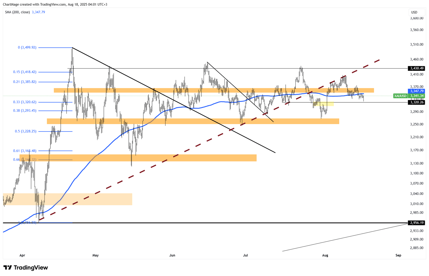 El lunes, el oro (XAU/USD) subió a alrededor de 3352 dólares por onza después de que las conversaciones entre Trump y Putin terminaran sin producir un alto el fuego o una tregua. El resultado se consideró favorable para el presidente ruso, especialmente después de que Trump dijera que se sentiría decepcionado si no se llegaba a un acuerdo. Los mercados esperan ahora la reunión de Trump con el presidente ucraniano Volodymyr Zelenskiy para obtener más señales geopolíticas, mientras que se espera que el simposio de Jackson Hole del jueves ofrezca orientación sobre las perspectivas de la política de la Reserva Federal.