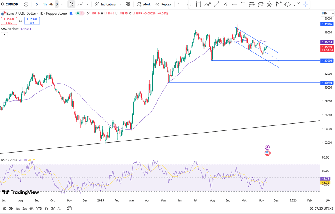 Euro kesulitan menembus level 1,1600, bertahan di dekat 1,1590 karena selera risiko membaik menjelang pemungutan suara DPR untuk membuka kembali pemerintahan AS. Pasar menunggu konfirmasi bahwa penutupan akan berakhir. Pejabat The Fed menyampaikan pesan yang beragam, dengan John Williams mengisyaratkan kemungkinan ekspansi neraca sementara Raphael Bostic menekankan prioritas stabilitas harga. Di Eropa, inflasi Jerman bertahan di dekat target 2% ECB, menggarisbawahi perbedaan kebijakan antara ECB dan The Fed.