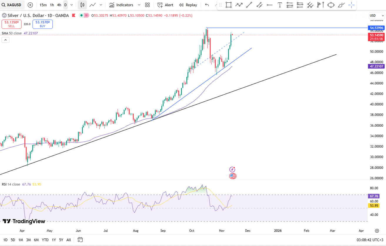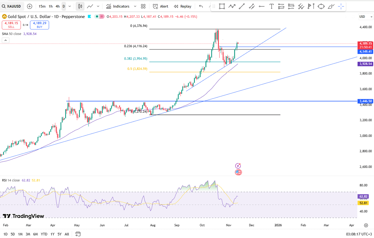 Emas diperdagangkan mendekati $4.180 per ons pada hari Kamis, bertahan di level tertinggi tiga minggu karena ketidakpastian ekonomi AS dan ekspektasi pelonggaran kebijakan The Fed yang lebih lanjut mendukung permintaan. Penutupan ekonomi diperkirakan akan berakhir setelah DPR menyetujui RUU pendanaan, meskipun Gedung Putih memperingatkan bahwa data ketenagakerjaan dan inflasi Oktober mungkin tertunda. Data swasta menunjukkan PHK yang berkelanjutan, menyoroti pelemahan pasar tenaga kerja dan mendukung ekspektasi pemangkasan suku bunga The Fed, dengan pasar memperkirakan peluang 65% untuk penurunan suku bunga sebesar 25 bps bulan depan. Emas naik hampir 5% minggu ini karena para pedagang melihat ruang untuk pelonggaran lebih lanjut.
