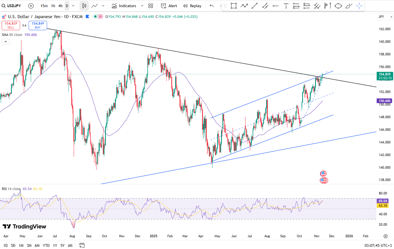 Yen bertahan di kisaran 154,7 karena Perdana Menteri Takaichi kembali menegaskan dukungannya terhadap suku bunga rendah. Gubernur BOJ Ueda mengatakan bank tersebut menginginkan inflasi moderat yang ditopang oleh pertumbuhan upah. Pasar memperkirakan kemungkinan kecil kenaikan suku bunga dalam waktu dekat, meskipun para pejabat memperingatkan terhadap depresiasi yen yang berlebihan. Sementara itu, harga produsen menunjukkan hasil yang lebih baik dari ekspektasi.
