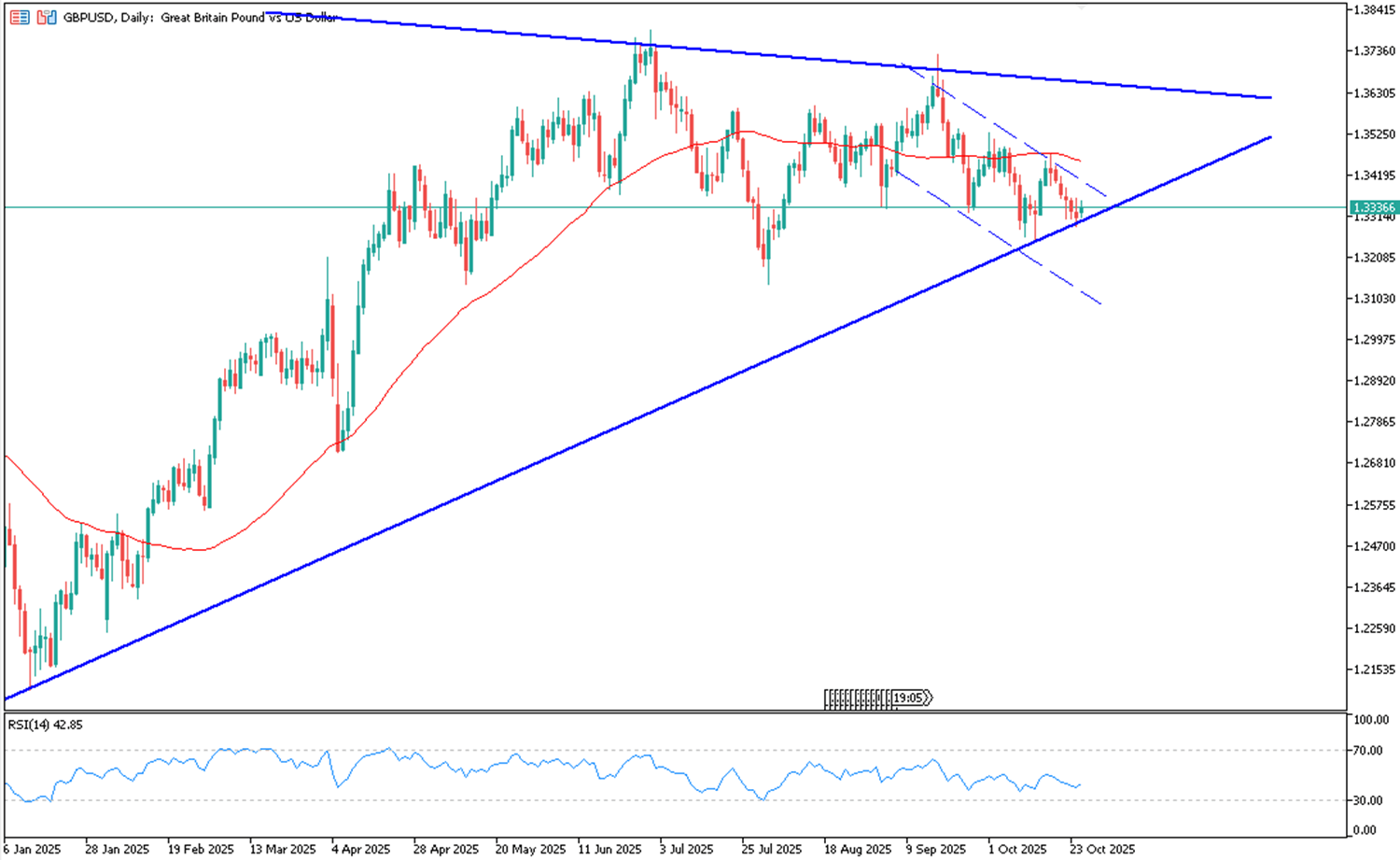 Euro bertahan di kisaran $1,16 dengan pergerakan terbatas. Optimisme atas kemajuan perundingan perdagangan AS-Tiongkok mendukung sentimen menjelang pertemuan Trump-Xi pada hari Kamis. ECB diperkirakan akan mempertahankan suku bunga, sementara The Fed mungkin memilih untuk menurunkan suku bunga menyusul data ketenagakerjaan dan inflasi yang lemah. Investor juga menantikan laporan PDB dan inflasi Zona Euro yang akan datang akhir pekan ini.