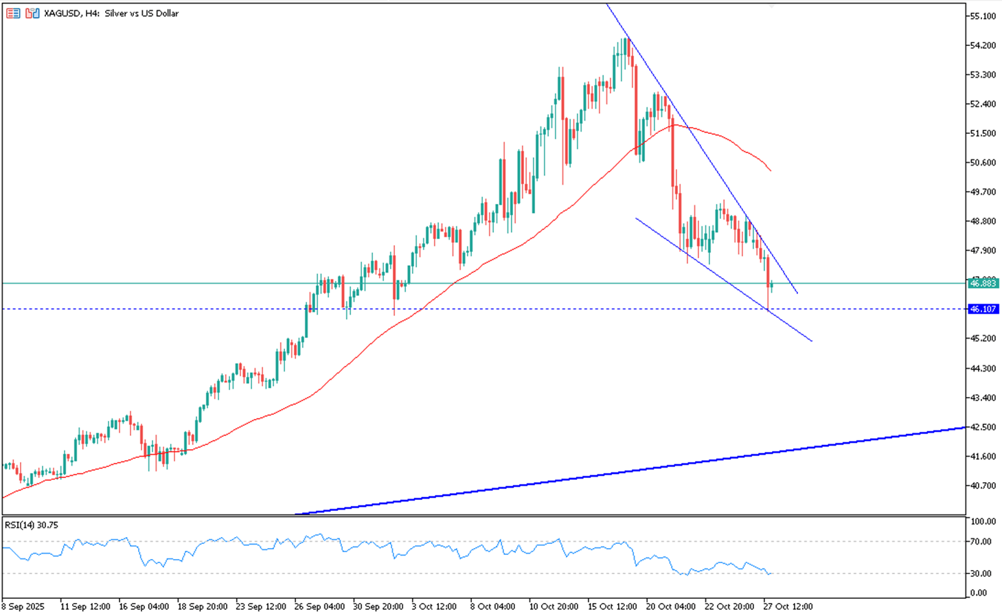 Harga perak bertahan di kisaran $46,80 pada sesi Asia hari Selasa, memperpanjang penurunan hari ketiganya setelah jatuh 3,78% karena investor beralih ke aset berisiko di tengah optimisme atas perundingan dagang AS-Tiongkok. Para pejabat dari kedua negara mengumumkan di Malaysia bahwa kesepakatan kerangka kerja tarif telah tercapai, membuka jalan bagi Trump dan Xi untuk menyelesaikannya di Korea Selatan minggu ini.
