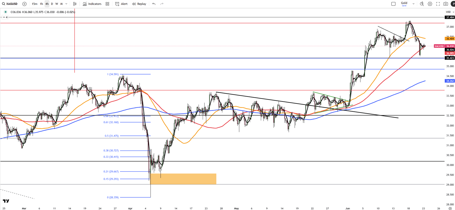 Perak (XAG/USD) naik mendekati $36,10 pada hari Senin, mengakhiri penurunan tiga hari berturut-turut karena meningkatnya ketegangan di Timur Tengah yang meningkatkan permintaan safe haven. Kenaikan tersebut menyusul serangan udara AS terhadap tiga lokasi nuklir Iran pada hari Minggu. Iran berjanji untuk menanggapi, sementara Trump memperingatkan bahwa setiap pembalasan akan dibalas dengan kekuatan yang lebih besar.