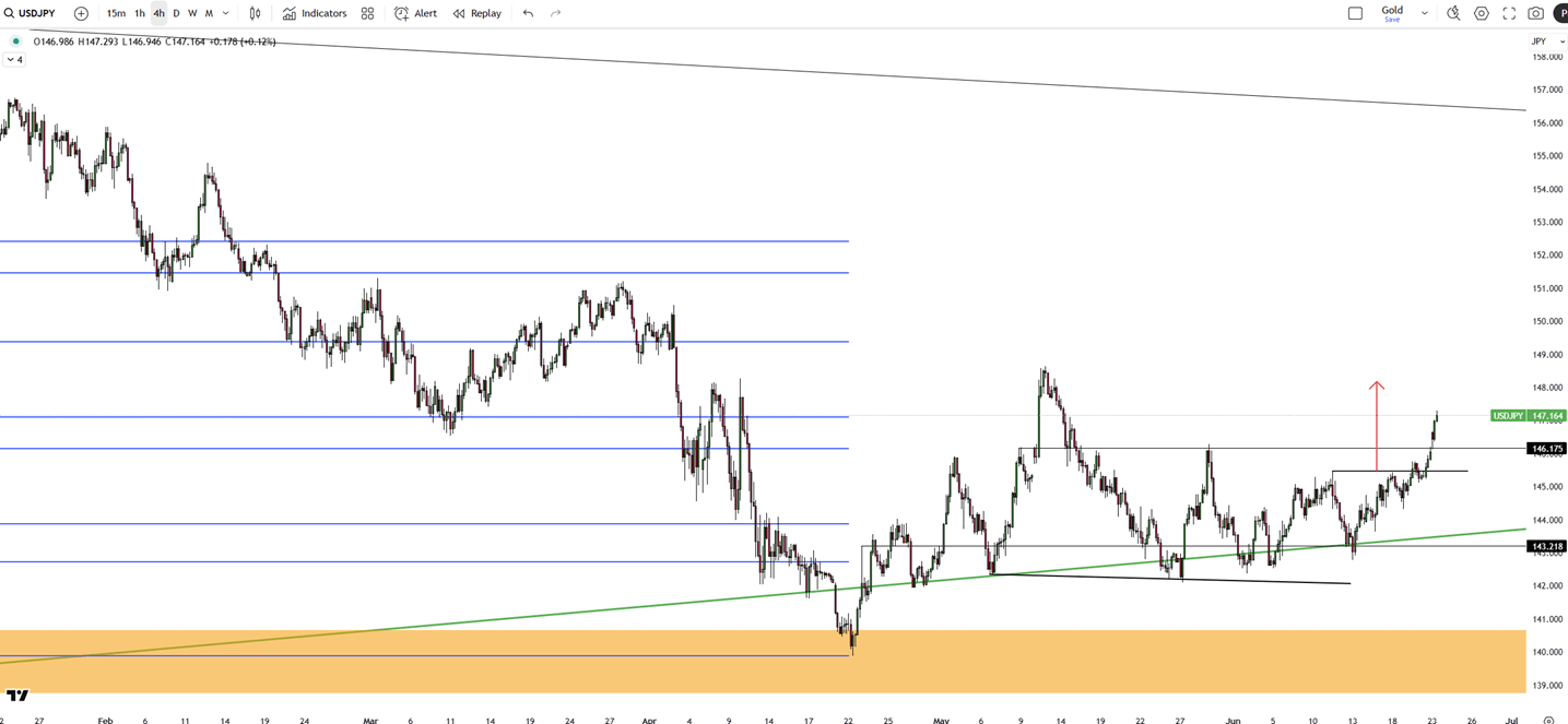 Yen jatuh melewati 146 pada hari Senin, level terendah dalam lebih dari lima minggu, karena dolar AS menguat karena permintaan safe haven setelah serangan udara AS di lokasi nuklir Iran meningkatkan ketegangan di Timur Tengah. Di dalam negeri, sektor manufaktur Jepang tumbuh pada bulan Juni untuk pertama kalinya sejak Mei 2024, dan jasa meningkat selama tiga bulan berturut-turut, menunjukkan ketahanan ekonomi.