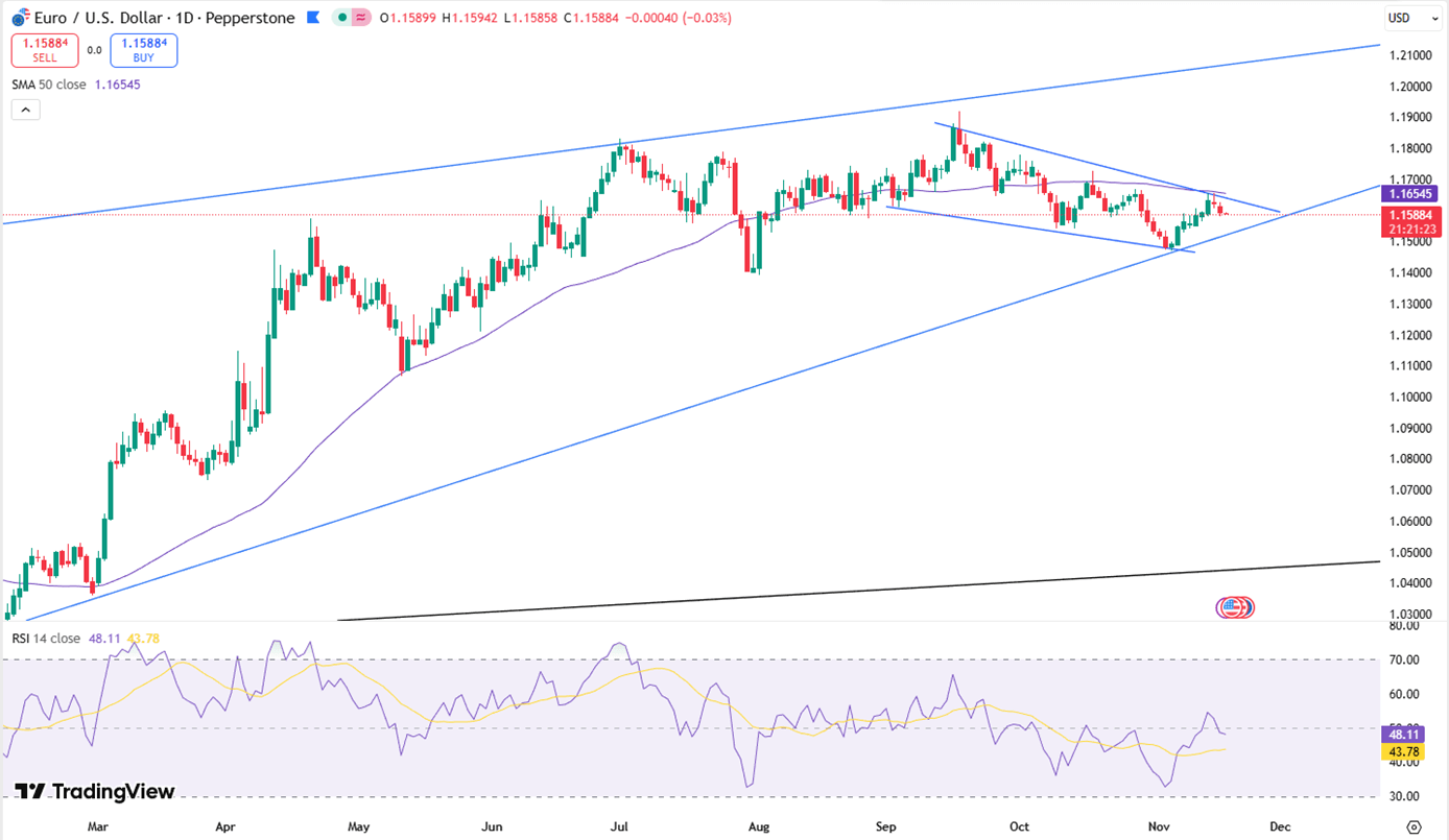 The euro held near $1.16 in quiet trading, with investors looking to upcoming ECB remarks and postponed US data for clearer direction. ECB Vice President de Guindos said inflation is moving in the right direction but cautioned about risks linked to tariffs and sovereign debt. At the same time, the European Commission raised its 2025 Eurozone growth forecast to 1.3%, supported by stronger export demand from the United States.