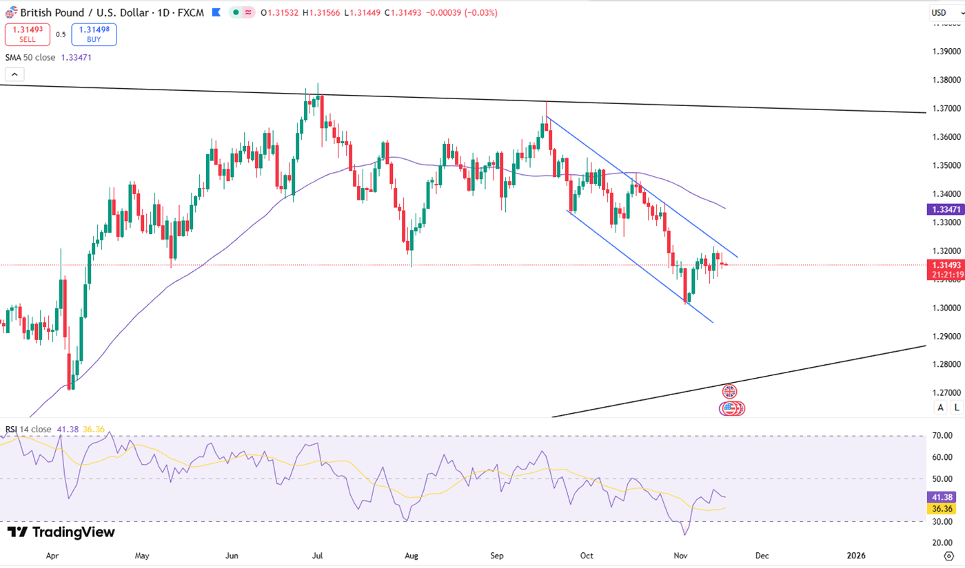 GBP/USD stayed weak near 1.3150 on Tuesday as the Pound softened after Chancellor Rachel Reeves scrapped planned income-tax hikes, heightening fiscal concerns despite a lower deficit outlook from the OBR. Markets expect her to pursue alternative revenue measures through threshold and salary-sacrifice adjustments. Recent soft UK data, including flat Q3 growth and a drop in September GDP, has reinforced expectations of a December BoE rate cut. Traders now await upcoming inflation figures and flash PMIs for clearer signs of economic cooling.