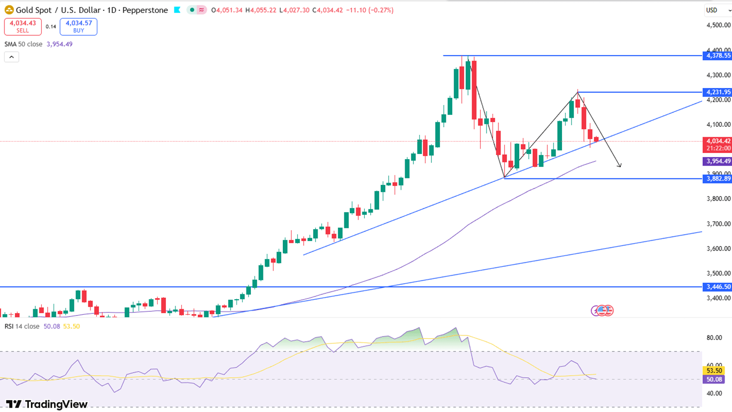 Gold eased toward $4,020 per ounce on Tuesday, extending its decline for a fourth session as expectations for a December US rate cut continued to fade. The absence of fresh US data and firm messaging from Fed officials kept sentiment cautious. Traders now await Wednesday’s FOMC minutes and Thursday’s delayed September jobs report, with the odds of a December cut falling to about 43%.