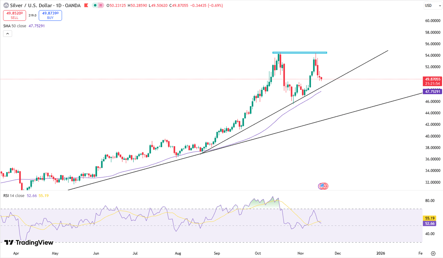 Silver (XAG/USD) extended its decline on Tuesday, trading near $49.50 as fading expectations for a December Fed rate cut pressured the metal. Markets now assign a 43% chance of a 25 bp cut, down from 62% a week ago. Investors await Wednesday’s Fed Minutes and Thursday’s September jobs report for clearer signals. Fed Vice Chair Philip Jefferson warned that labor-market risks now outweigh inflation concerns, while Governor Christopher Waller said he supports a December cut amid slowing hiring.