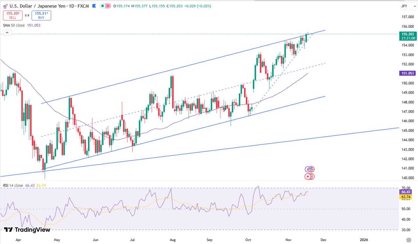 Technically, resistance stands near 155.20, while support is firm at 154.00.