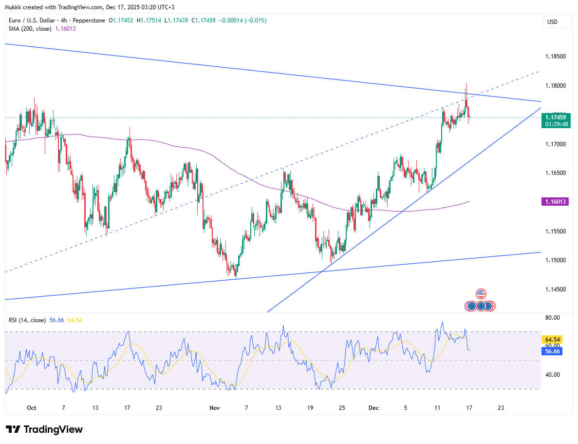 The EUR/USD pair fell toward 1.1730 during early European trading as the US Dollar found renewed strength. Potential declines might be restricted because investors anticipate the ECB will maintain interest rates at 2% during the upcoming Thursday session. Although November payrolls grew by 64,000, exceeding expectations, a rise in unemployment to 4.6% suggests a softening labor market that may eventually limit the strength of the greenback.