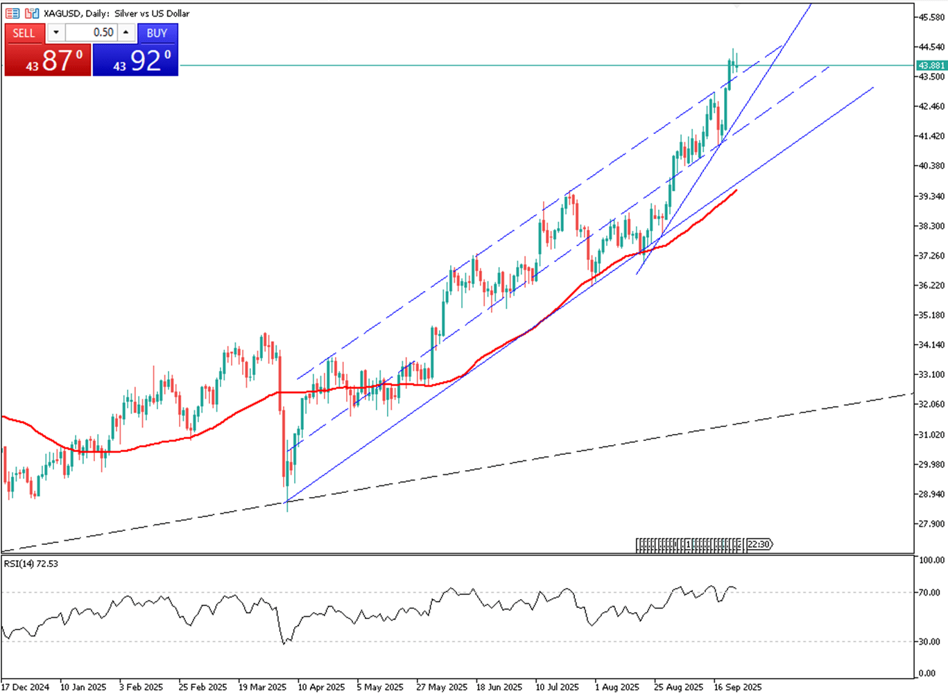 Silver traded around $43.90 per ounce in Thursday’s Asian session, recovering from earlier losses and staying close to Tuesday’s 14-year peak of $44.47. Markets widely expect a 25-basis-point Fed cut at the October meeting, while strong industrial demand and tight supply from solar, EV, and electronics sectors continue to support prices.