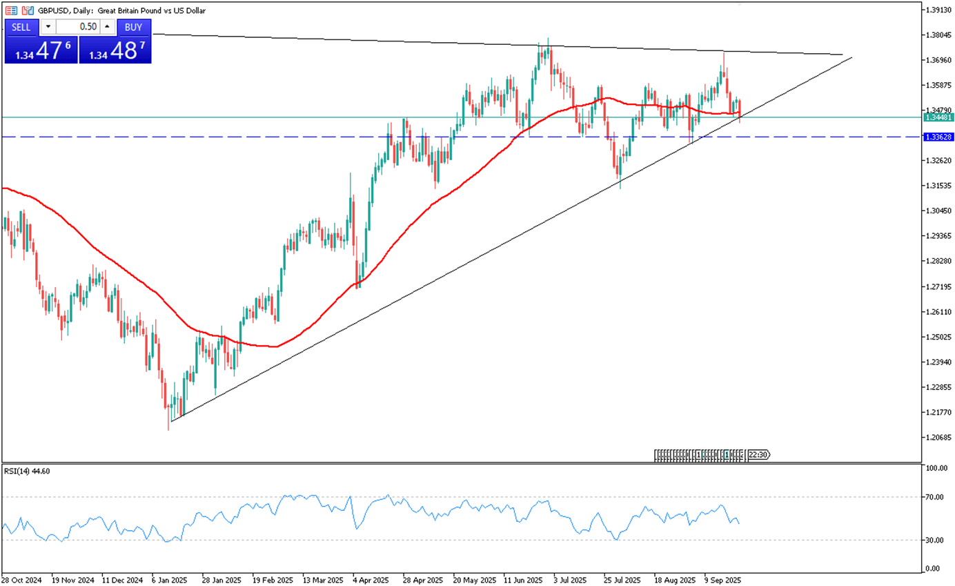 GBP/USD edged higher to around 1.3460 in Thursday’s Asian session, recovering as the US Dollar softened ahead of key data, including Q2 GDP, Durable Goods Orders, and Jobless Claims. Market focus remains on Fed commentary, with Chair Powell stressing caution and the balance between inflation and labor risks. Diverging views persist, as Mary Daly backed further cuts to support growth while Austan Goolsbee opposed multiple moves. These divisions keep traders alert, especially with tariff concerns adding pressure.