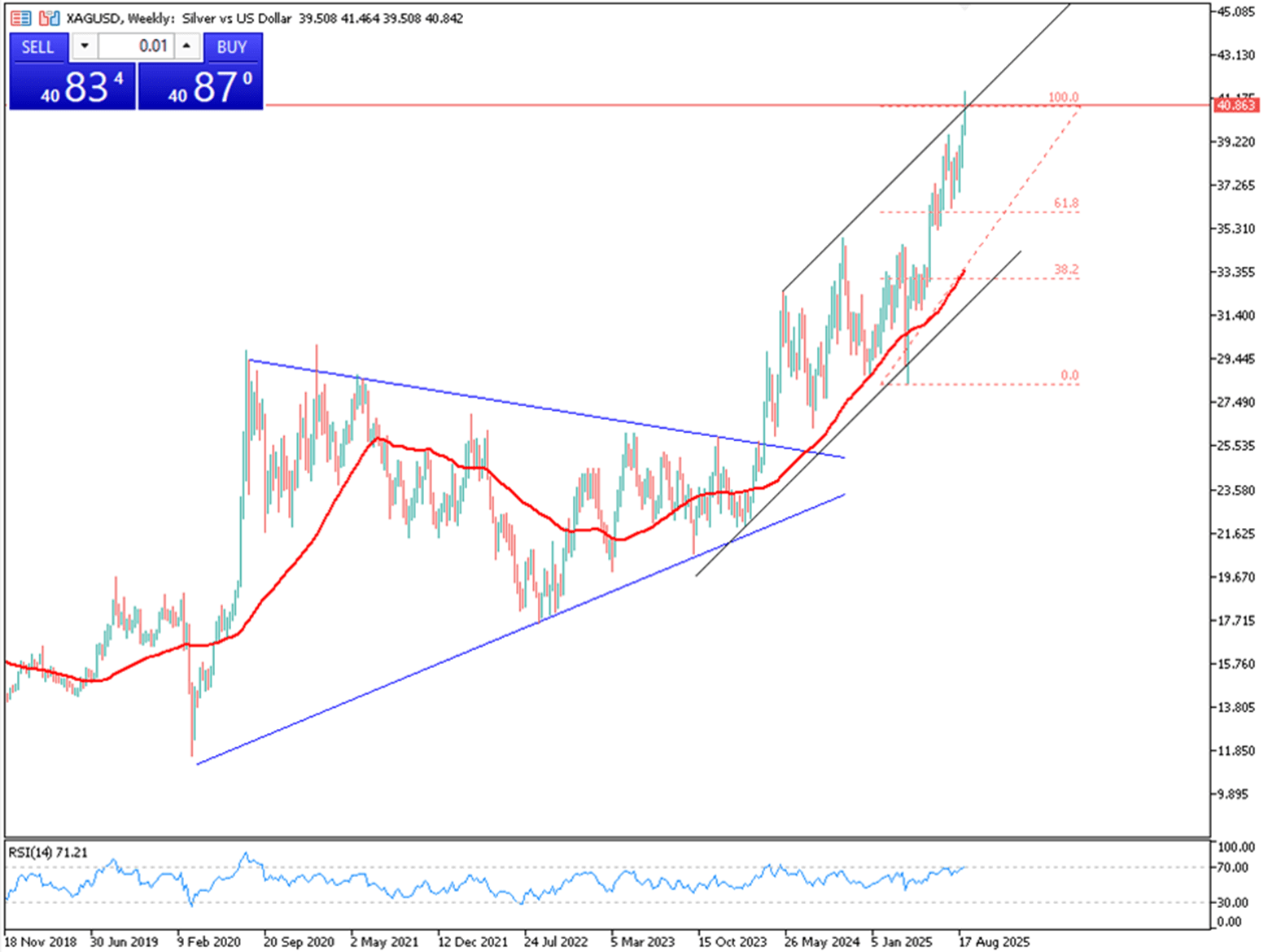 Silver retreated 1% to $40.50 per ounce ahead of key US labor data. Even so, the outlook stayed firm with support from Fed rate cut expectations, safe-haven demand, and industrial buying from China’s solar sector. Precious metals have surged in recent weeks, with markets now pricing in nearly a 98% probability of a 25 bps cut this month.