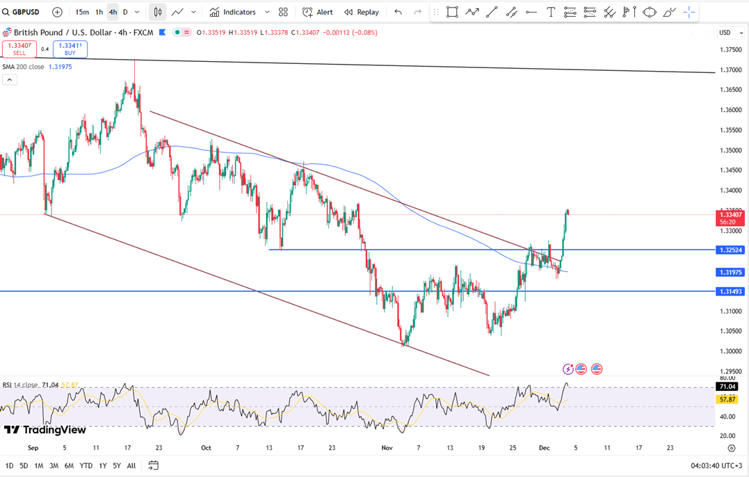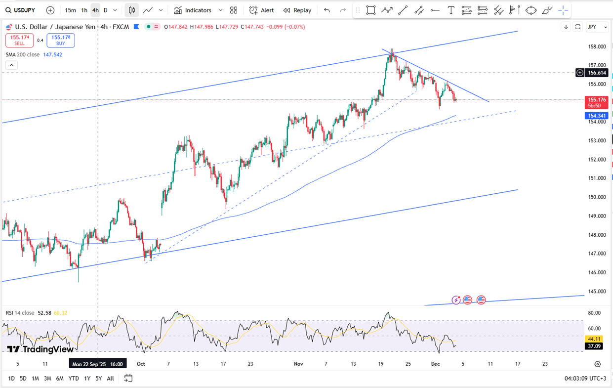 GBP/USD slipped toward 1.3330, easing from a two-month high as renewed USD demand trimmed gains. Even so, expectations of a Fed rate cut next week, supported by soft PMI and ADP figures, continued to cushion the downside. Political uncertainty adds another layer as Trump plans to reveal Powell’s successor early next year, with Kevin Hassett viewed as the frontrunner.
