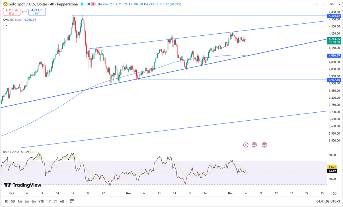 Gold sees support around $4,170, while resistance is located near $4,250.