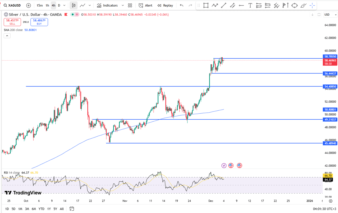 Gold hovered above $4,210 after ADP showed a sharp decline in US private-sector jobs, pushing the probability of a Fed cut next week to nearly 90%. Silver stayed close to record highs near $58, supported by strong ETF inflows and tightening supply across London and Shanghai.