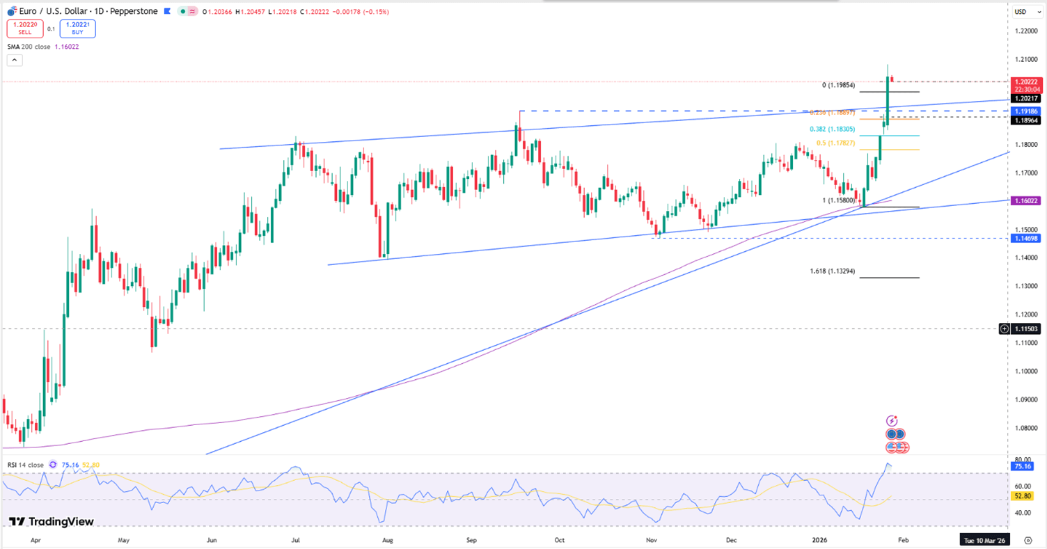 Momentum remains constructive, with 1.1950 in focus on the upside, while 1.1810 defines nearby support.