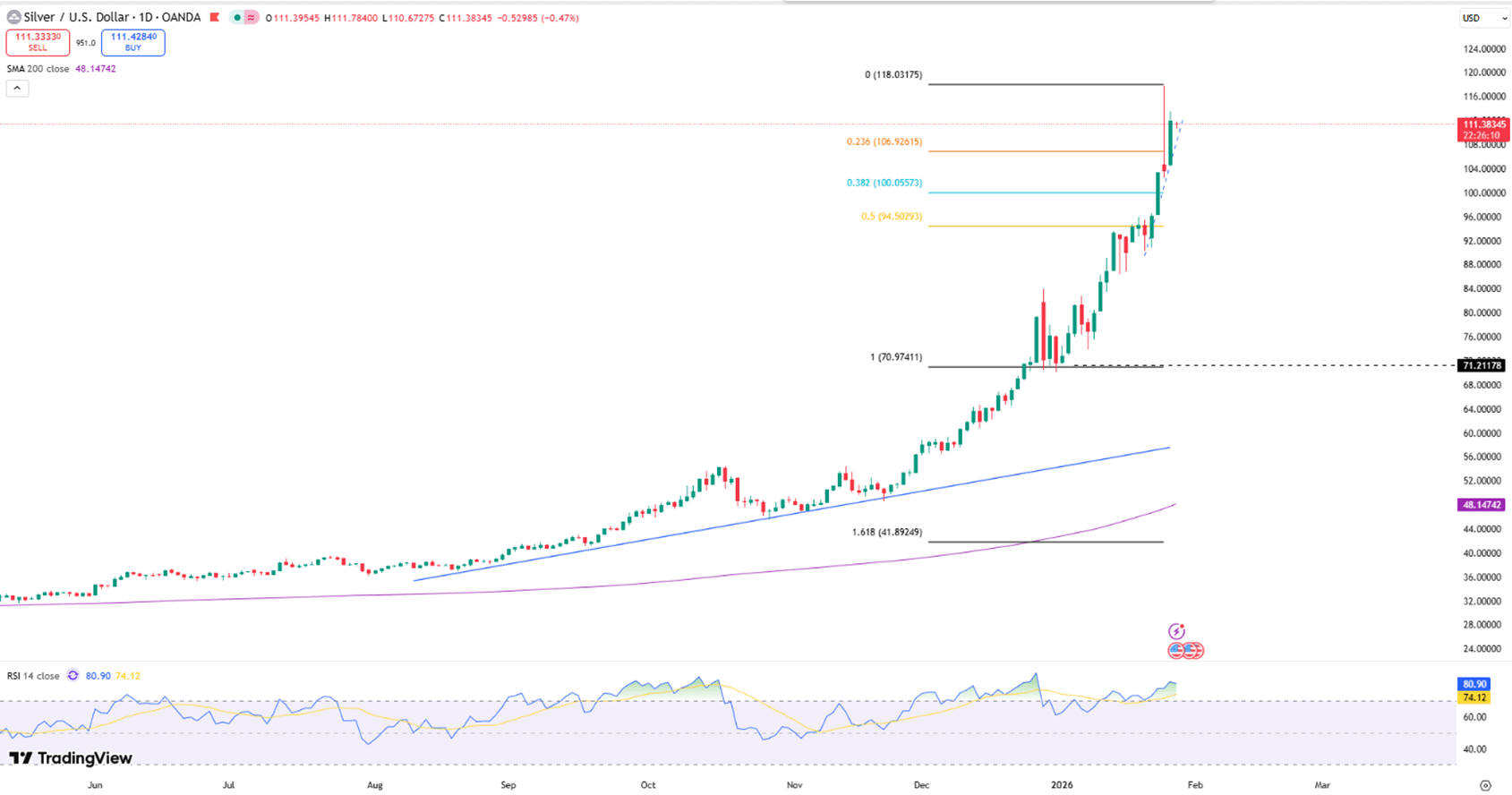 Silver climbed toward $115 an ounce on Wednesday, hitting fresh records as the dollar slid to a four-year low and investors piled into safe-haven metals. The move accelerated after President Trump downplayed dollar weakness, signaling support for a softer currency to support US exports. Policy uncertainty, including tariff threats and concerns over Fed independence, added momentum. In China, strong demand forced a major silver fund to halt trading after its premium surged. Ongoing supply deficits, Beijing’s export curbs, and heavy buying have lifted silver about 59% year to date.