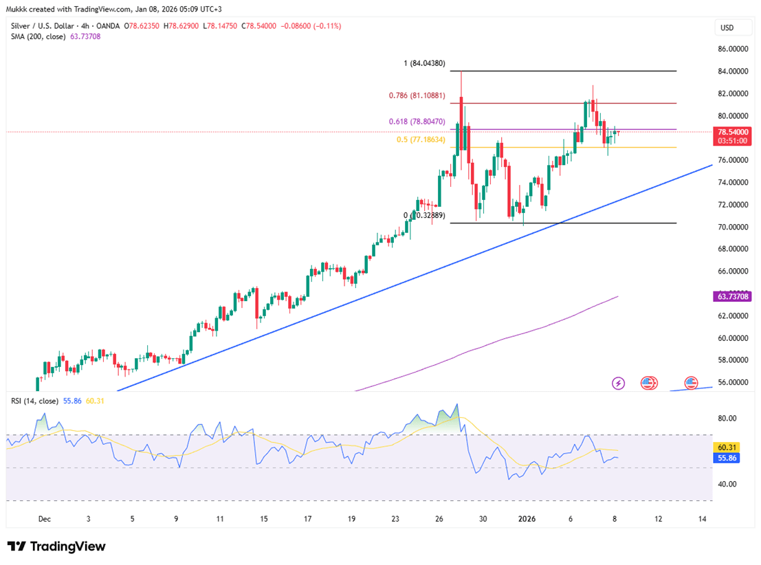 Silver traded around the $78.00 level during Thursday’s Asian session, showing limited intraday direction but holding above key support near $77.00. The price structure continues to favor dip-buying at lower levels, with momentum indicators signaling stabilization after the recent pullback. As long as this support holds, the near-term outlook remains cautiously positive. However, a clear break below the trend support could open the door to a deeper corrective move.