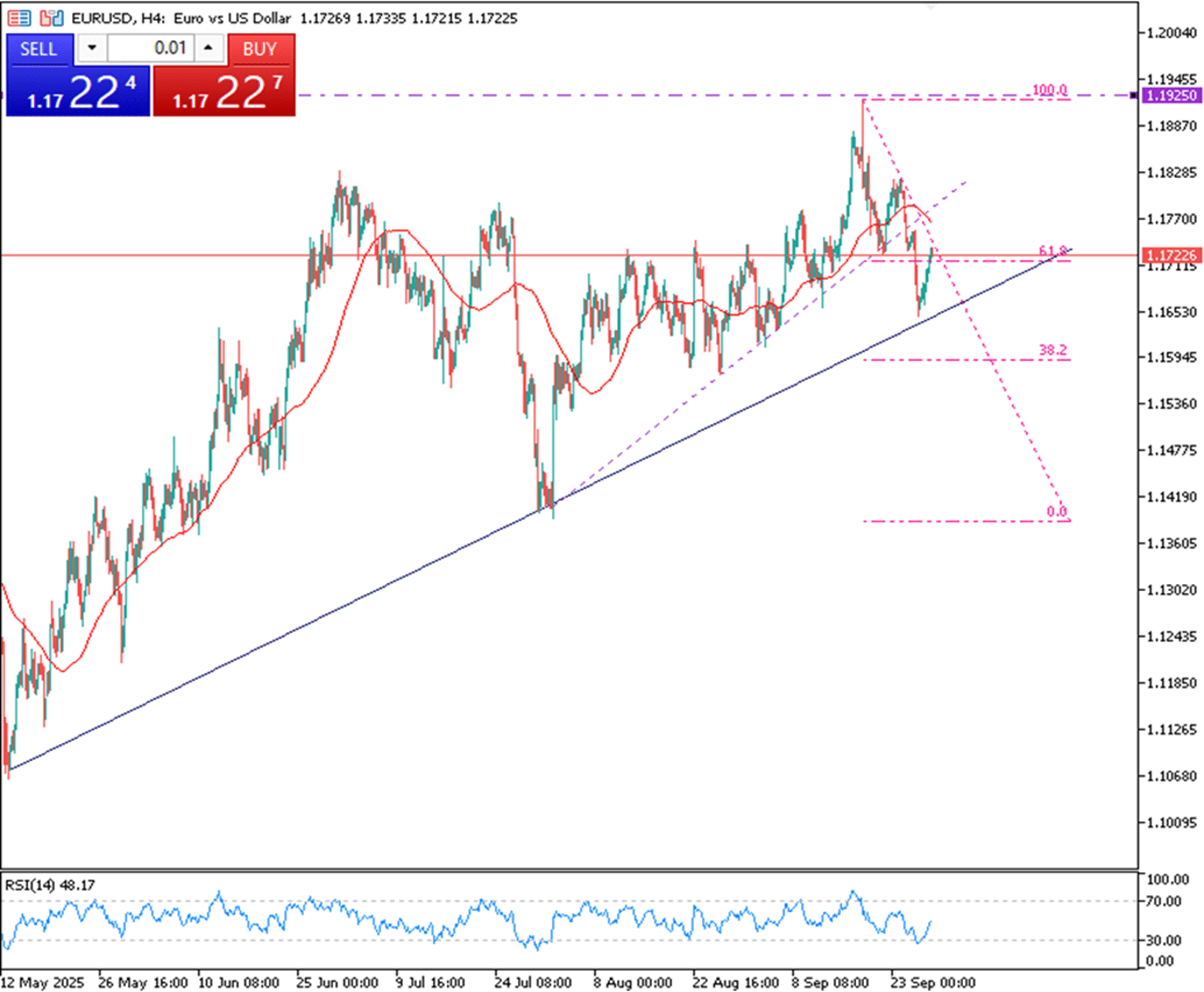 EUR/USD rose for a second session, trading near 1.1720 in Asian hours on Monday as the U.S. Dollar weakened. The move followed August inflation data that strengthened expectations for further Fed easing. Headline PCE rose 2.7% year-on-year, up from 2.6% and in line with forecasts, while core PCE stayed at 2.9%. The Fed cut rates by 25 basis points in September to 4.00%–4.25%. Markets now price an 88% chance of another cut in October and 65% in December, according to CME’s FedWatch Tool.