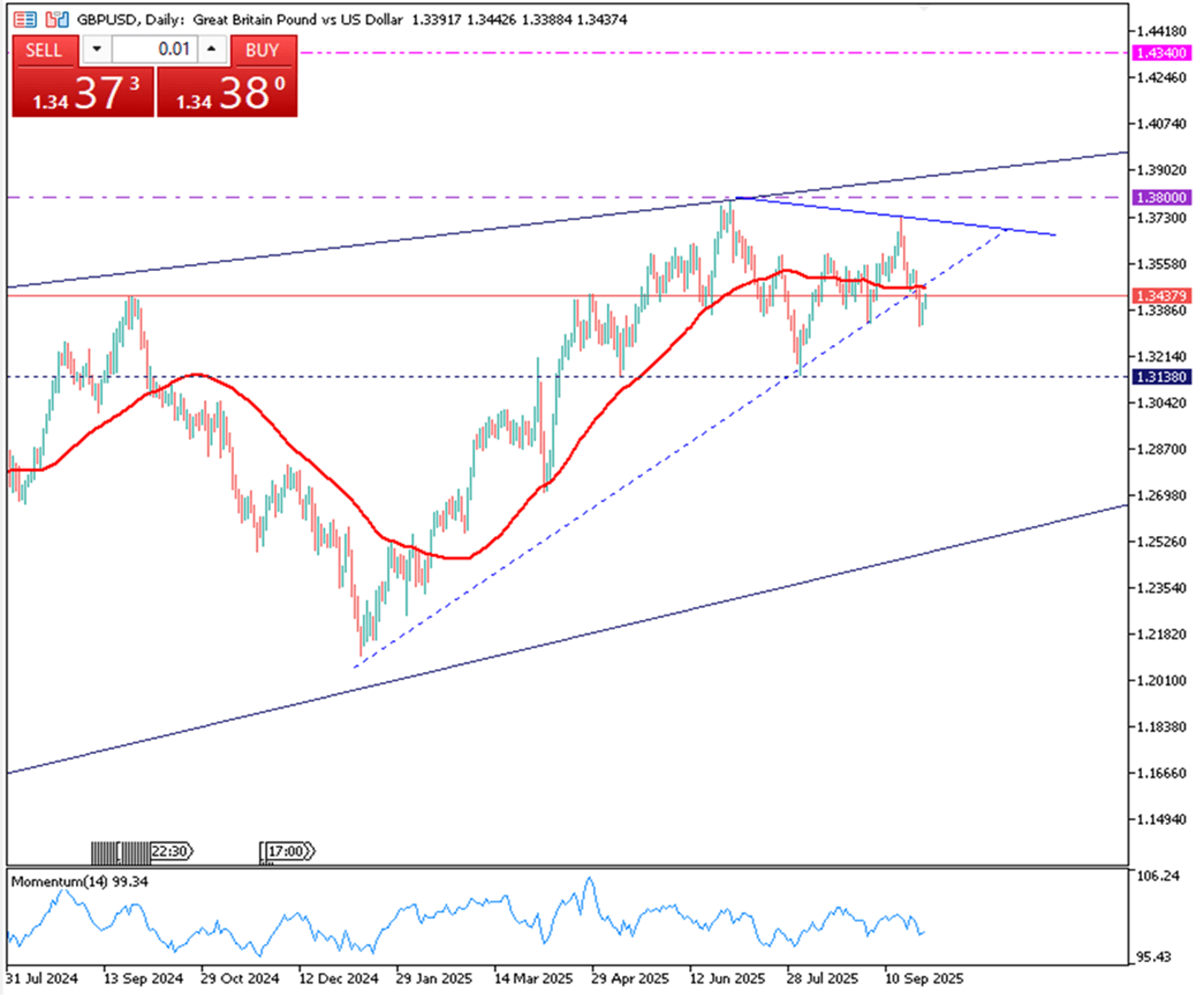 GBP/USD edged up to 1.3415 in early Asian trade on Monday, supported by a weaker dollar after August inflation data reinforced expectations of more Fed rate cuts. The PCE Price Index rose 2.7% annually and core PCE 2.9%, both in line with forecasts. The Fed cut rates by 25 bps in September, and markets now price an 88% chance of another cut in October and 65% in December, according to CME FedWatch.