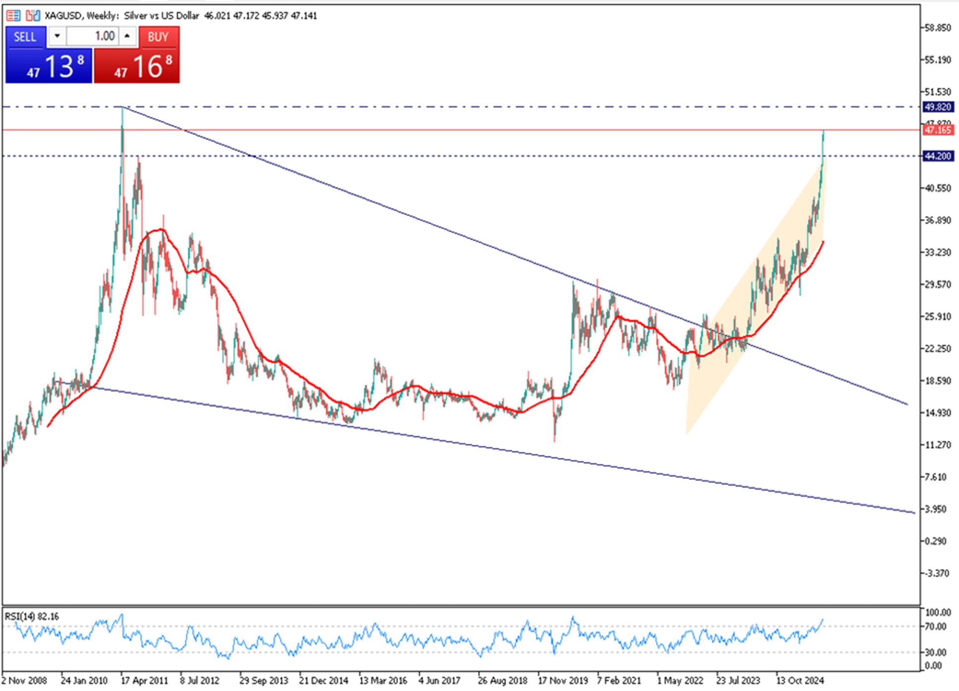 Silver (XAG/USD) surged to a 14-year high of $47.10 in Asian trade Monday, supported by expectations of more Fed rate cuts. US August PCE inflation matched forecasts at 2.7%, with core at 2.9%. CME FedWatch shows an 89% chance of an October cut and 66% for December. Lower rates support the appeal of non-yielding assets, lifting silver alongside broader precious metals demand.