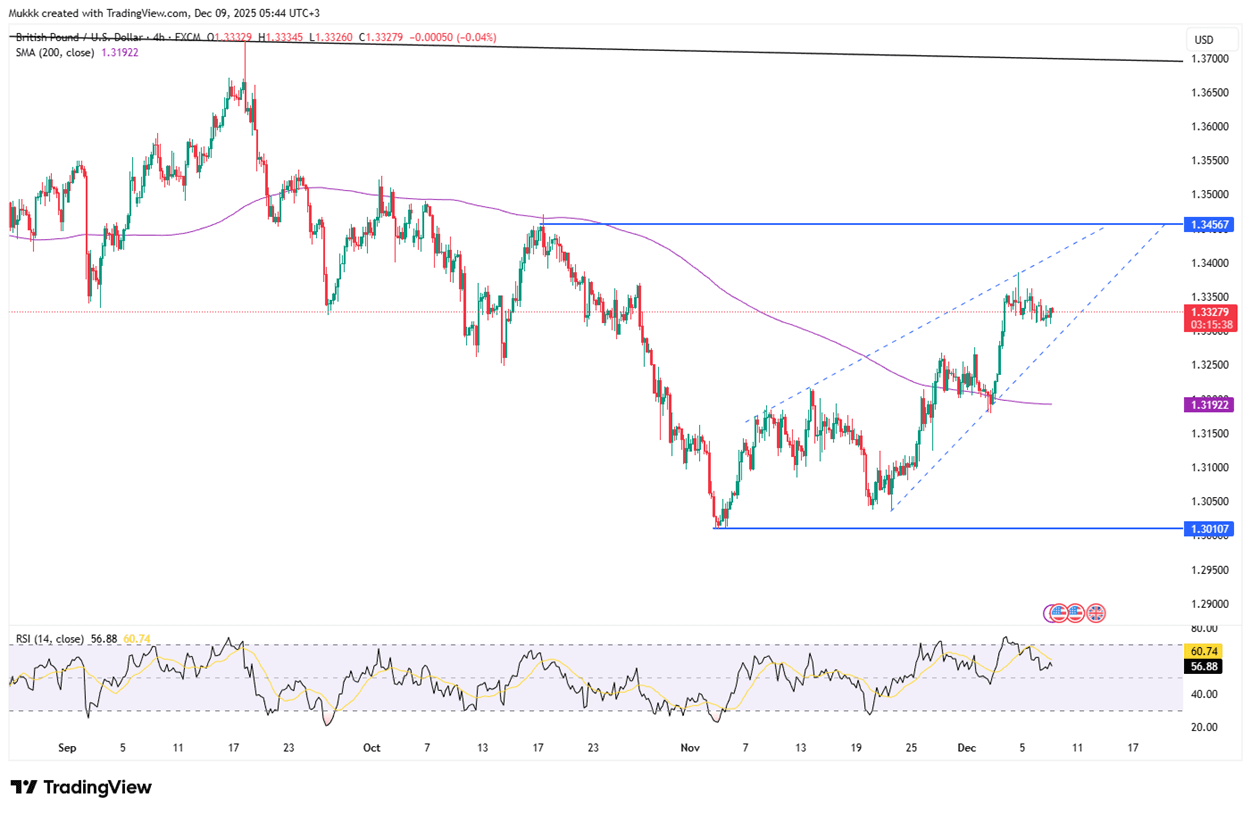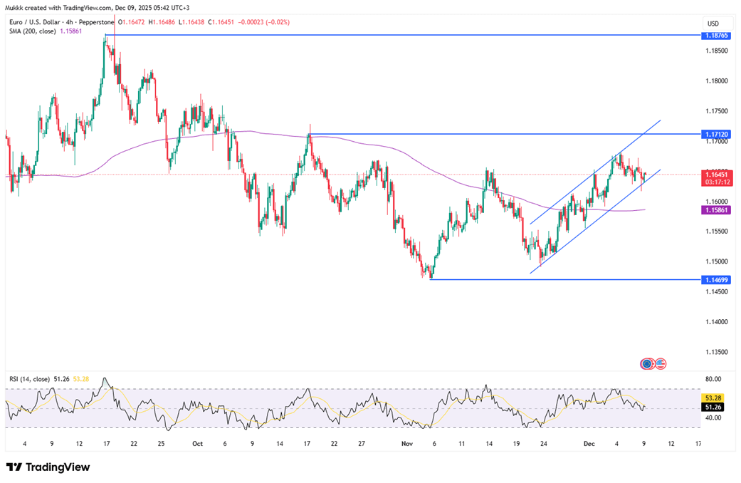 The euro traded just above $1.1640, staying close to its strongest levels since mid-October after ECB official Isabel Schnabel suggested that the Bank’s next move could lean higher. She pointed to firmer growth signs and rising inflation pressures, indicating that December projections may shift upward. With the eurozone maintaining steady momentum, expectations still point to unchanged ECB rates through 2026, while US pricing reflects a high probability of a 25-bp cut and additional easing next year.