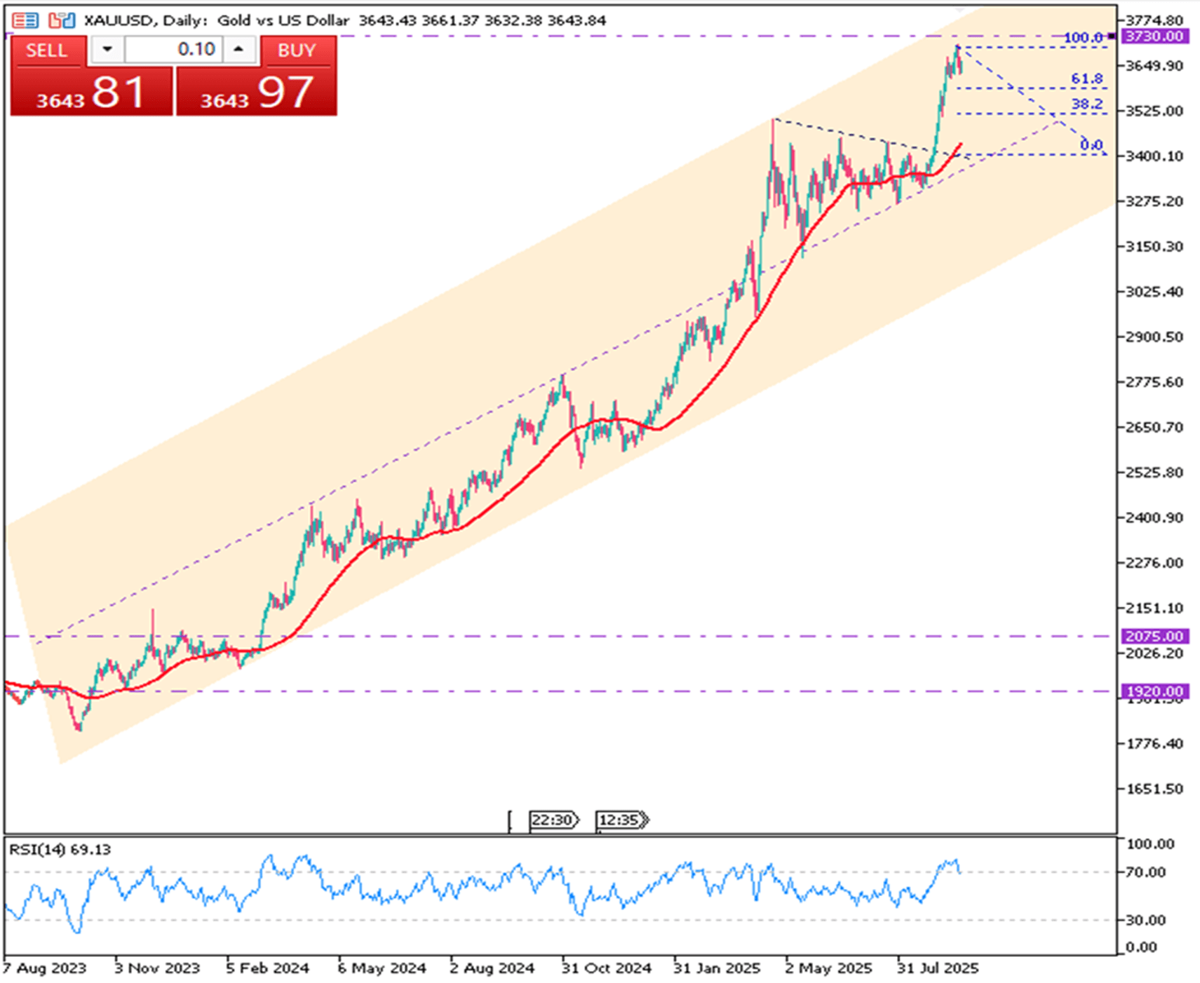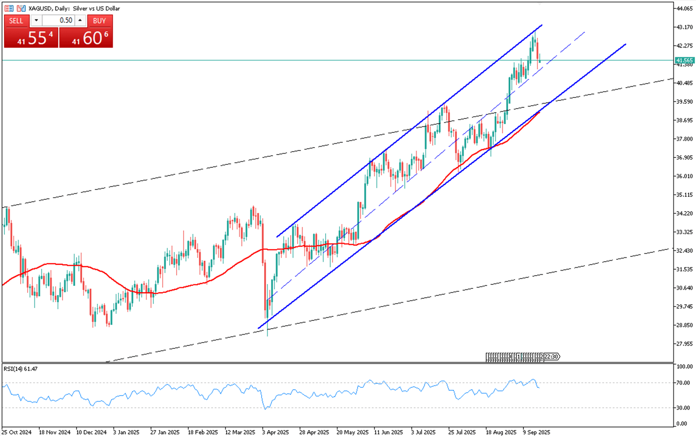 Silver climbed to around $42.3 per ounce on Friday, rising 18.7% from its July 31 trough. Despite recent pullbacks, silver remains near its peak. However, a less dovish Fed tone and a resilient US dollar suggest tighter price action ahead. Daily RSI indicators also hint at potential divergence, signaling that an intermediate correction could be on the horizon even as prices hold near their highs.