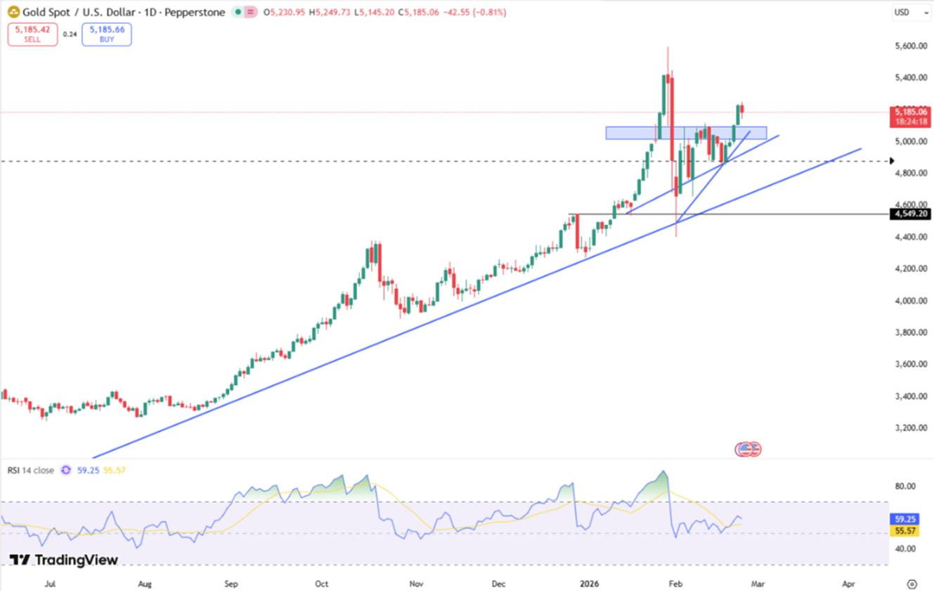 Gold slipped below $5,190 on Tuesday, snapping a four-day rally as investors reassessed shifting trade policies and geopolitical risks. The Trump administration is working to reinstate its global tariff strategy after a Supreme Court setback, introducing a new 10% levy effective today with potential increases to 15%. In response, the EU suspended its trade pact ratification and India postponed negotiations. Markets also remain focused on Thursday's U.S.-Iran nuclear talks; while President Trump favors diplomacy, he warned of consequences if an agreement is not reached.