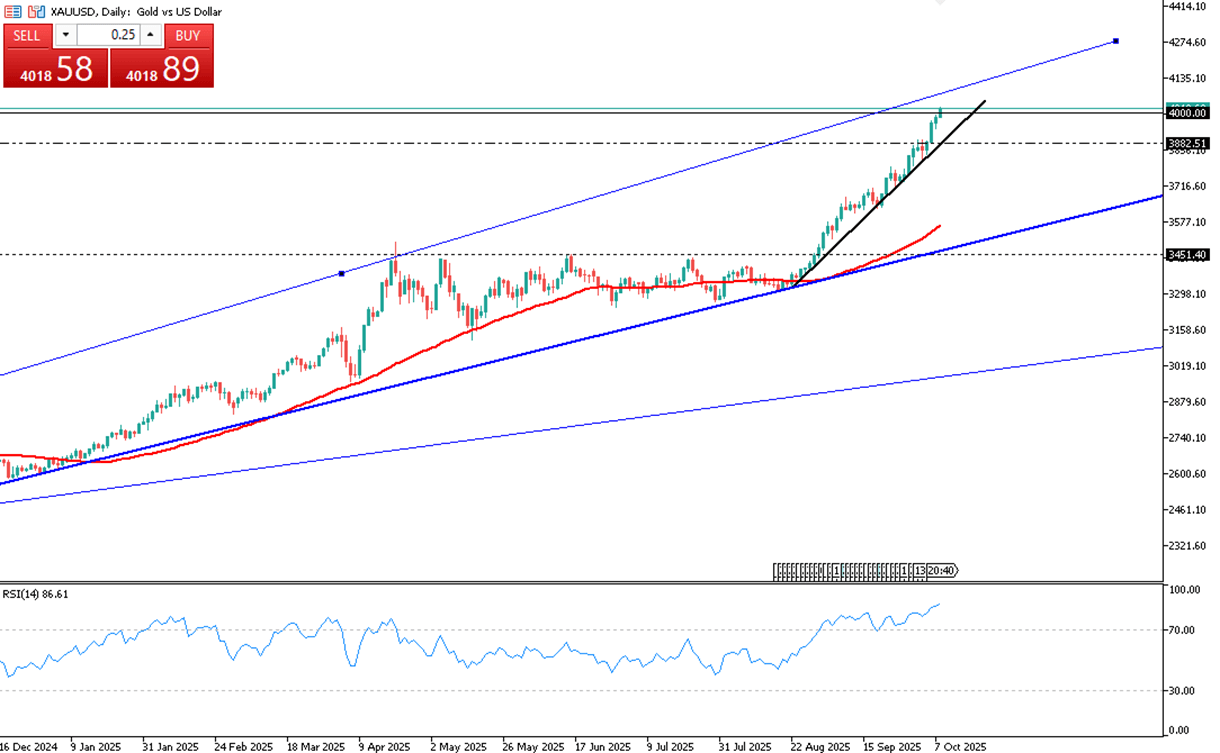 Gold’s strong rally persisted, with prices firmly surpassing the key $4,000 level. Ongoing global uncertainty continues to push investors toward safe-haven assets such as the US dollar and gold. However, the metal appears significantly overbought on the daily chart, indicating a potential short-term correction before resuming its upward trend.