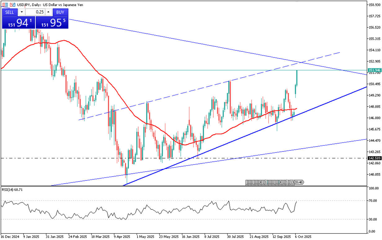 The Japanese yen fell past 152 per dollar on Wednesday, its weakest level since February, after soft wage data reduced expectations for Bank of Japan rate hikes. Real wages declined 1.4% year-on-year in August, the eighth consecutive drop as inflation outpaced pay growth. Meanwhile, pro-stimulus lawmaker Sanae Takaichi’s leadership win reinforced expectations of continued fiscal support and accommodative monetary policy.