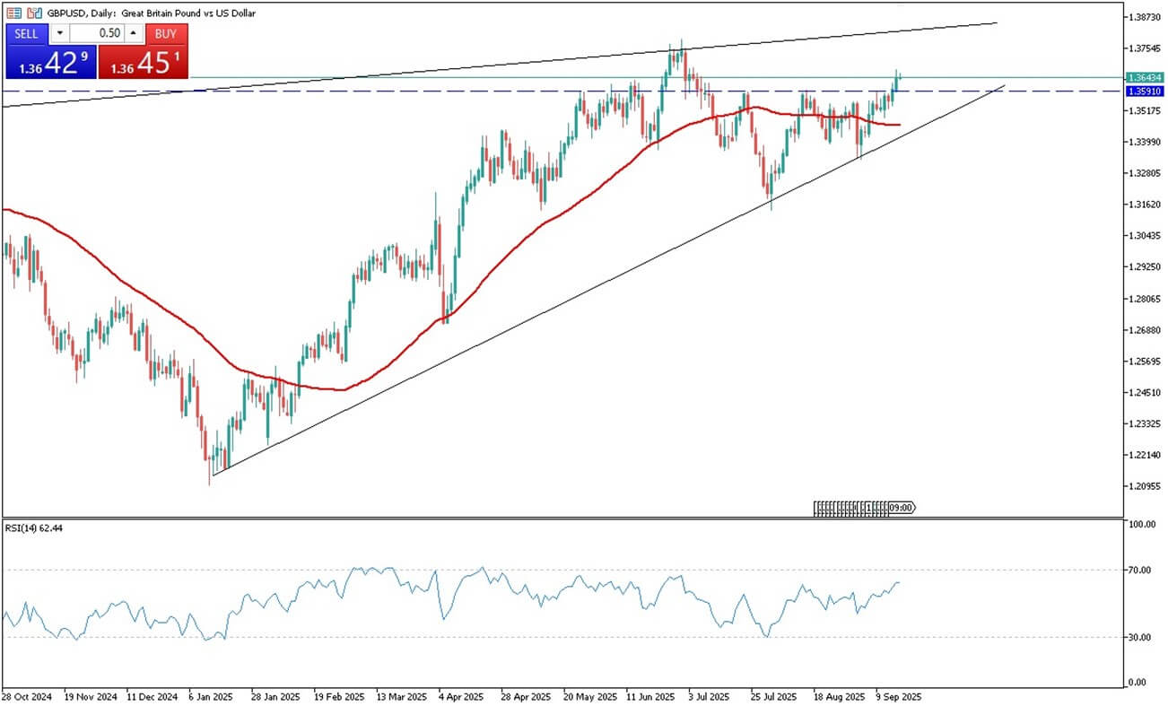 The British pound climbed above $1.363, its highest since early July, ahead of a busy week of central bank decisions and UK data. The BoE is expected to hold rates at 4% while slowing its £100 billion bond unwind. August inflation is forecast at 3.8% YoY, with steady unemployment and moderate wage growth keeping near-term rate cuts unlikely. Meanwhile, the Fed is widely expected to deliver a 25 bps cut, with markets pricing in more easing through 2025.