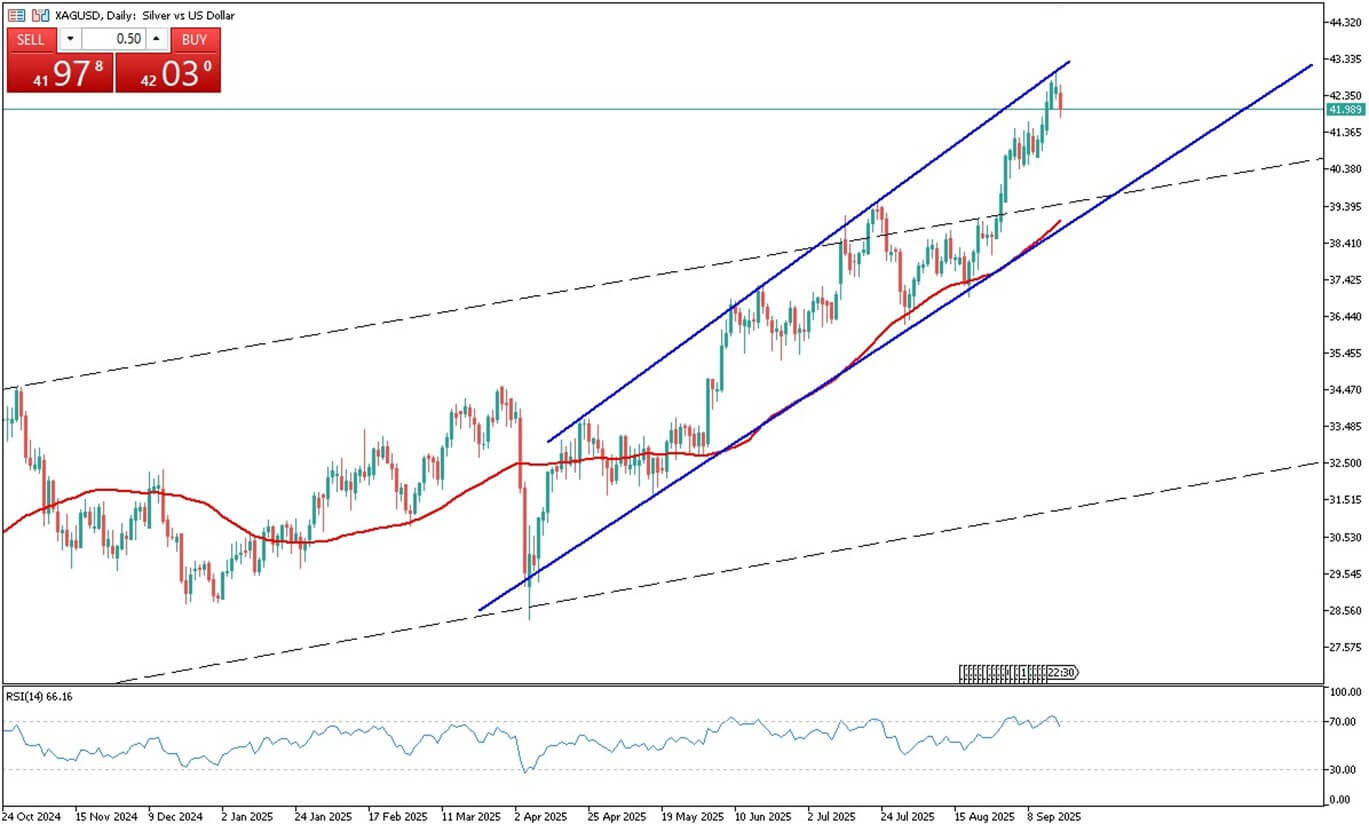 Silver slipped over 1% to around $42 per ounce on Wednesday, retreating from 14-year highs as investors took profits ahead of the Fed’s policy announcement. The Fed is expected to cut rates by 25 bps, with about 67 bps of easing priced in this year, driven by a weaker labor market despite inflation above 2%. Focus is on the Fed’s dot plot, while strong industrial demand from solar, EVs, and electronics alongside supply constraints, continues to support silver.
