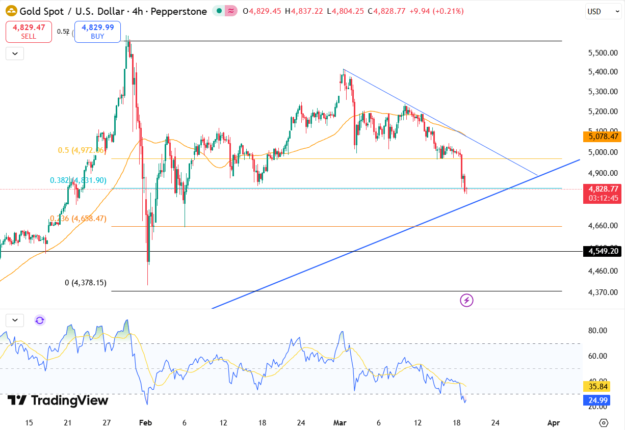 Gold sees support near $4900, while resistance is around $4750.