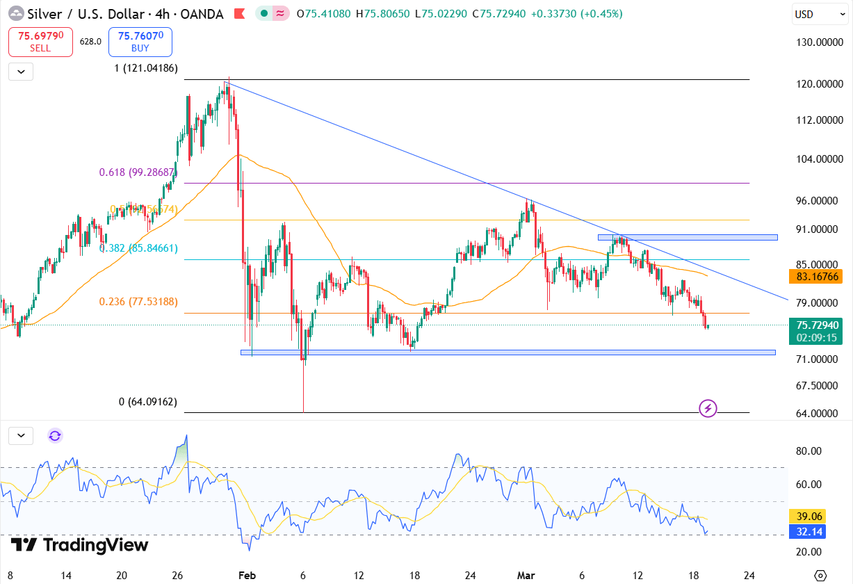 Silver stabilized above $75, following a 5% plunge in the prior session. The metal faced ongoing pressure from the Federal Reserve’s hawkish stance and surging oil prices. While one rate cut is still projected for 2026, policymakers clarified that easing will only begin once inflation demonstrates a definitive downward trend.