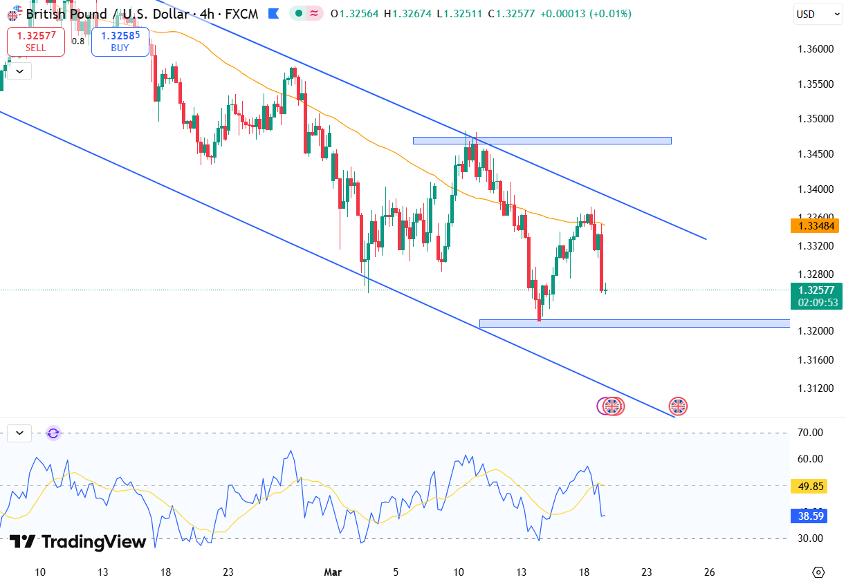 GBP/USD tumbled 0.7% on Wednesday, decisively breaking through the critical 1.3300 support level. This decline extends a broader retreat from the January peak of 1.3870, leaving the pair trading below key daily moving averages. A sharp bearish candle confirmed the end of a two-week consolidation phase. Sentiment was further dampened by the Federal Reserve’s decision to hold rates as Chair Jerome Powell’s relatively hawkish remarks supported the US Dollar across the board.