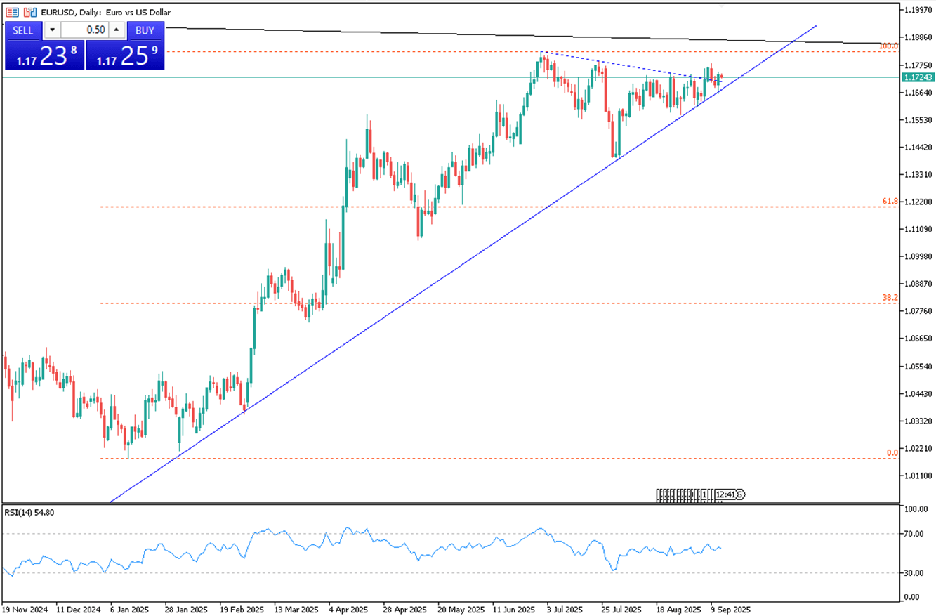The EUR/USD pair slipped to 1.1725 in Friday’s Asian session, pressured by a stronger U.S. Dollar, though losses may be limited with markets expecting a Fed rate cut next week. Focus now shifts to Germany’s August HICP and U.S. consumer sentiment data. On Thursday, the ECB kept rates at 2.0%, signaling confidence in growth and inflation. The move lowered expectations for further easing, with markets now pricing only a 40% chance of another cut by spring.