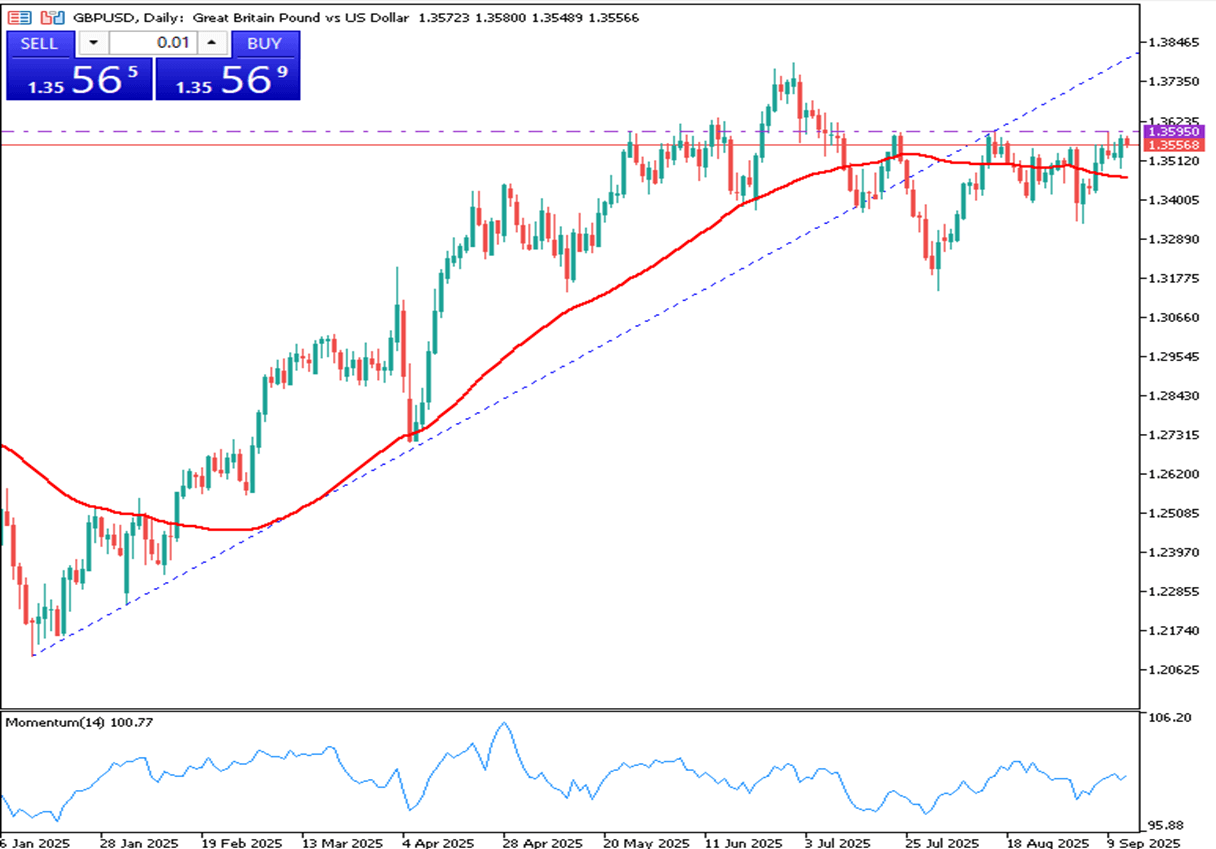 The British pound rose above $1.355 on Friday, up 0.33%, supported by broad U.S. dollar weakness as markets priced in more Fed rate cuts this year. Softer U.S. producer prices added pressure on the dollar, while UK fiscal comments had little effect. Traders now await August CPI, with results set to guide GBP/USD direction.