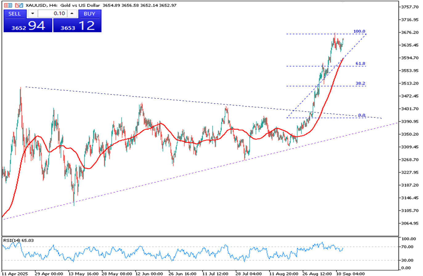 Gold nears $3,640 on Friday, marking a fourth weekly gain, driven by Fed rate cut expectations and safe-haven demand. U.S. inflation matched forecasts after a PPI drop, while jobless claims hit a four-year high, highlighting labor weakness. Markets price in a 25 bps cut, with speculation of 50. Geopolitical tensions, including U.S. tariff pressure on India and China, Middle East conflicts, and Russian drone strikes, added support.