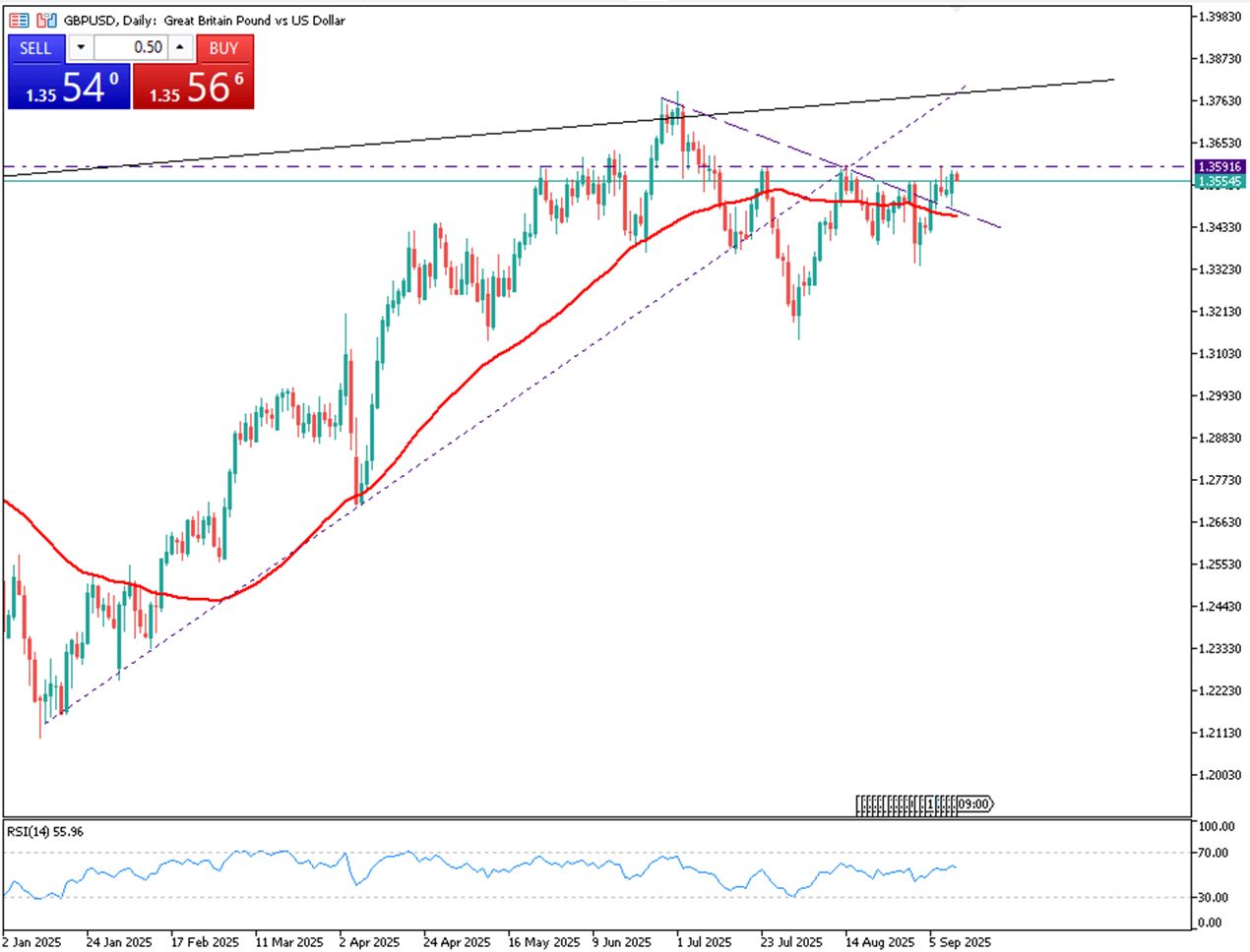 The British pound climbed above $1.360 on Tuesday, nearing a 10-week high ahead of central bank meetings and key UK data. The BoE is expected to hold rates at 4% on Thursday while slowing its £100 billion bond unwind. UK inflation for August is seen at 3.8%, with jobs and retail sales also due this week. Markets assign a one-in-three chance of a rate cut by December. Meanwhile, the Fed is widely expected to cut rates by 25 bps on Wednesday, with at least two more cuts priced in by year-end.