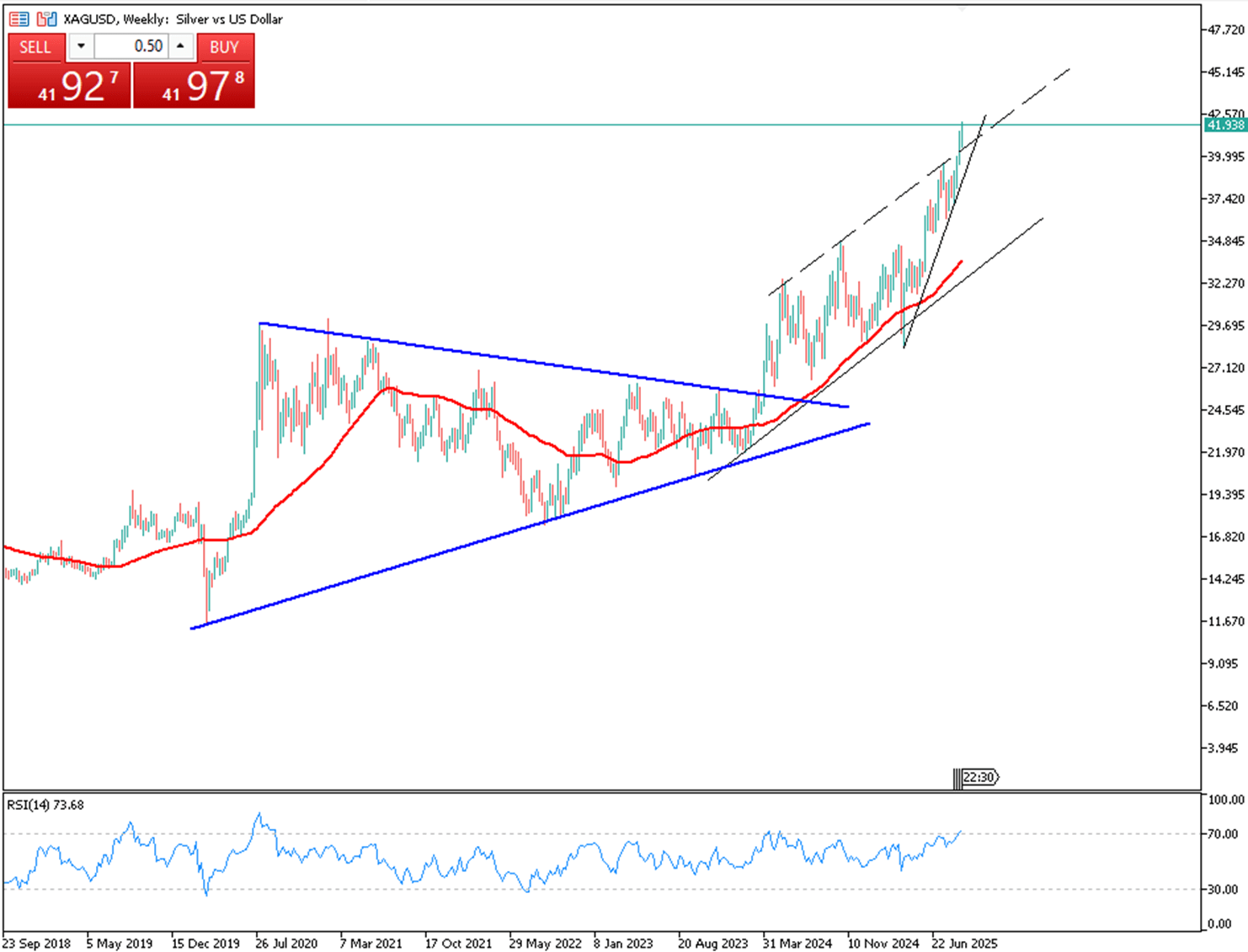 Silver consolidated just above $42 in Tuesday’s Asian session, holding near its highest since September 2011. The four-week rally has paused as traders await the Fed’s policy decision, with stretched RSI signaling limited room for fresh gains and the risk of sideways trade or a mild pullback.