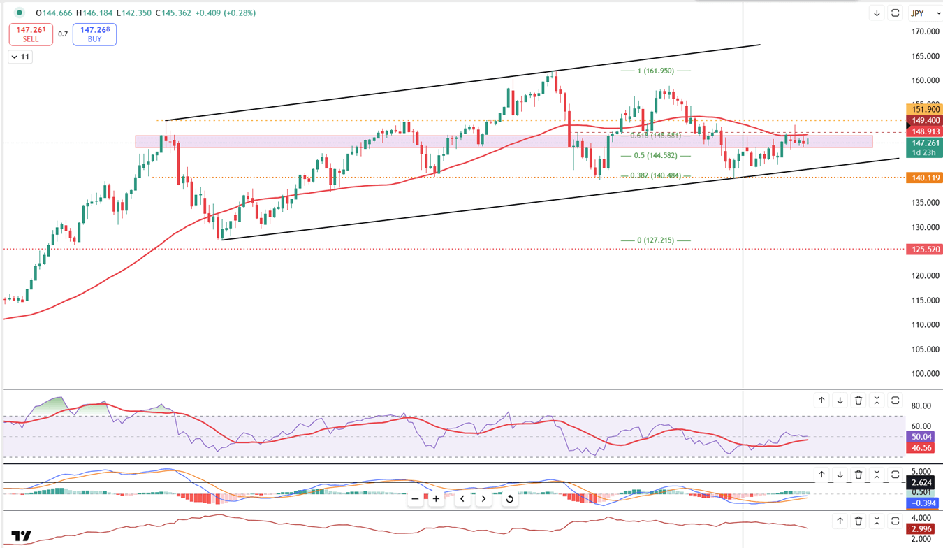 For USD/JPY, the nearest resistance is at 148.00, while the immediate support is at 145.00.