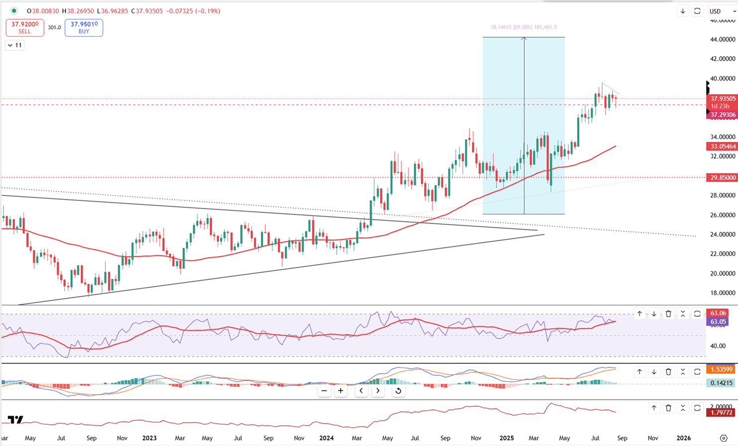 Silver (XAG/USD) climbed to about $37.85 in Asian trading on Thursday, supported by expectations of a September Fed rate cut. Stronger U.S. wholesale prices and retail sales reduced the likelihood of a larger 50 bps move, but markets still assign an 83% probability to easing. Lower rates are seen as supportive for the non-yielding metal, with investors awaiting Powell’s remarks at the Fed’s Jackson Hole symposium for further policy signals.