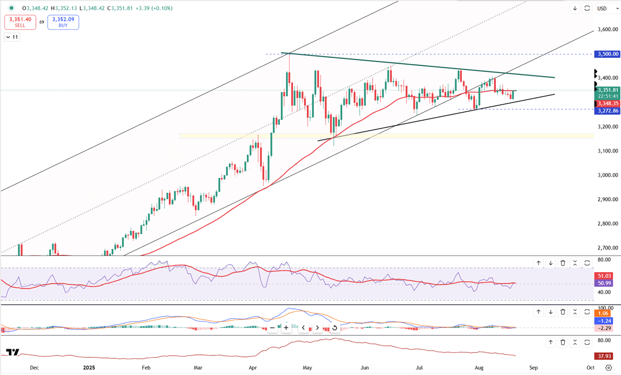 Gold steadied near $3,340 per ounce on Thursday as investors awaited Fed Chair Jerome Powell’s remarks at the Jackson Hole symposium for policy guidance. Markets currently assign an 82% probability to a September rate cut, though Fed minutes signaled caution, with officials highlighting inflation and labor market risks. On the geopolitical front, Russia warned that security discussions on Ukraine excluding Moscow represent a “road to nowhere.”