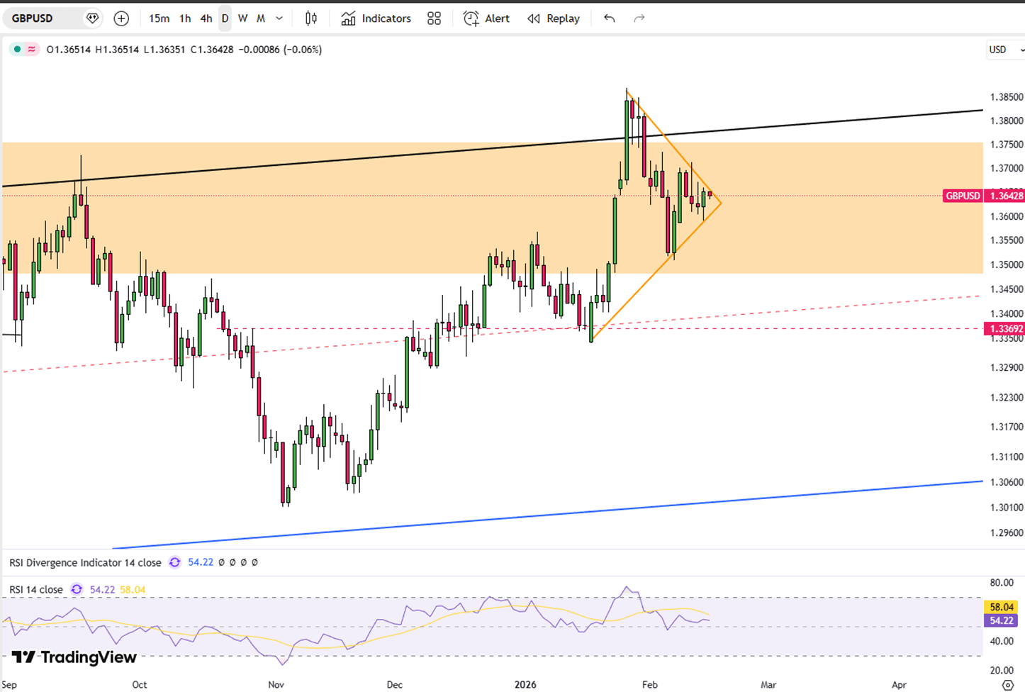 The British pound hovered near $1.36 as investors reacted to disappointing UK growth figures. The economy expanded by only 0.1% in the final quarter of 2025, falling short of forecasts and marking the slowest annual growth since early 2024. Unexpected drops in industrial output and construction underscored a fragile recovery, increasing political pressure on Prime Minister Keir Starmer. Markets are pricing in more Bank of England easing, following a recent hold at 3.75% and a dovish outlook projecting inflation toward the 2% target by April.