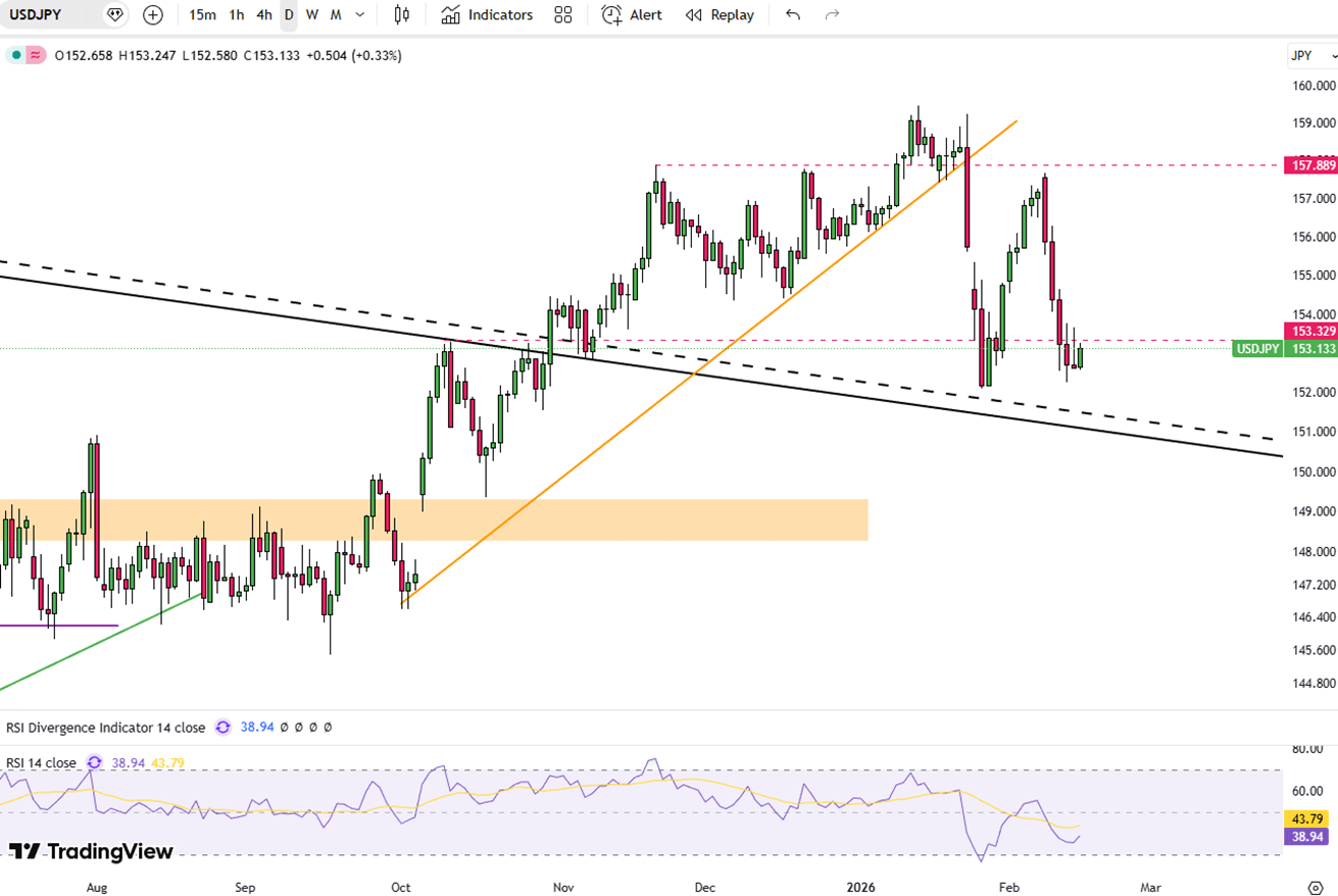 The Japanese yen slipped to approximately 153 per dollar on Monday, retreating after soft fourth-quarter growth data. Japan's economy expanded by just 0.1%, missing expectations for a more strong recovery despite a rebound from the previous quarter's contraction. Weak domestic demand remains a concern, with consumer spending rising only 0.1%. While Prime Minister Sanae Takaichi continues to advocate for proactive fiscal stimulus following her landslide win on February 8, the yen's earlier 3% weekly rally has stalled. Nevertheless, potential Bank of Japan rate hikes and intervention risks still offer underlying support.