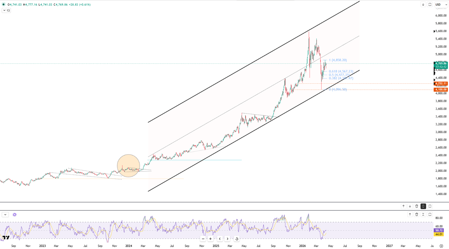 First resistance is seen at $4800, with initial support near $4610.