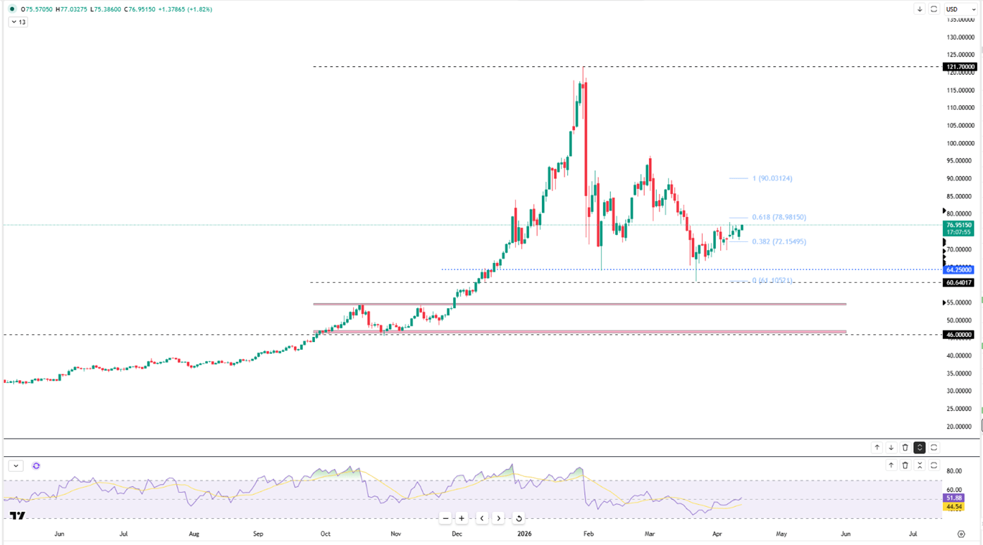 Silver rose toward $76 on Tuesday, recouping recent losses as the US and Iran signaled interest in negotiating a long-term ceasefire before their current truce ends. President Trump stated that Iran initiated contact following the US naval blockade of the Strait of Hormuz, while President Pezeshkian confirmed readiness for talks under international law. Easing oil prices further lowered inflation fears, softening the outlook for restrictive central bank policies and providing extra support for the metal.