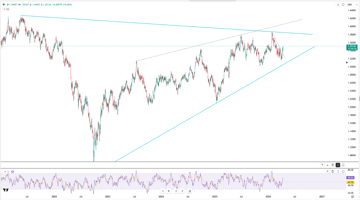 From a technical view, support stands near 1.3510, with resistance around 1.3350.