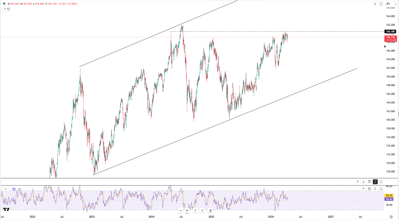 Initial resistance stands at 160.20, while the first support is located at 159.00.
